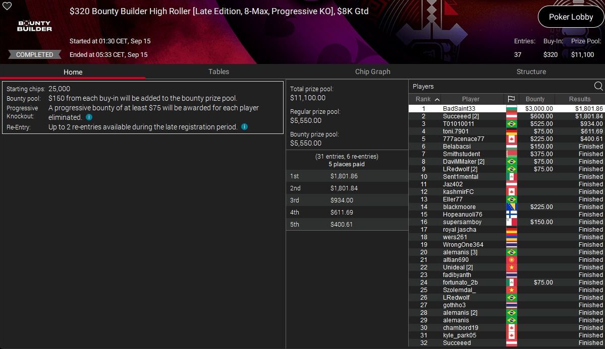 Jakob „Succeeed“ Miegel schließlich setzte den Schlusspunkt mit Platz 2 beim $320 Bounty Builder Late Edition, der ihm $2.400 Preisgeld einbrachte.