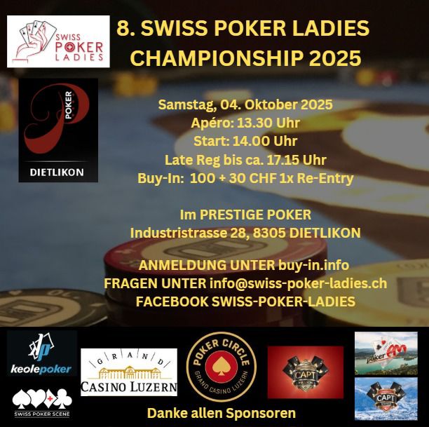 Die 8. Swiss Poker Ladies Championship organisiert von Swiss Poker Ladies steht vor der Tür. Ausgetragen wird sie wieder bei Prestige Poker in Dietlikon in der Nähe von Zürich! Wieder wird es spannende Gewinne im Preispool für die Top-Frauen der offenen Schweizer Meisterschaft geben. Für Pokerfans, Begleitungen und alle Spielerinnen und Spieler vor Ort werden neben der Frauen-Pokermeisterschaft auch zwei Side Events veranstaltet.