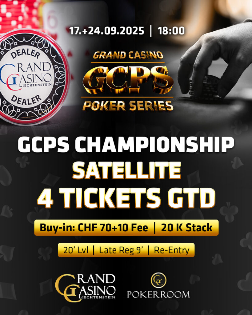 Heute geht es im GCLI im GCPS Championship Satellite um mindestens 4 Tickets à 550 CHF zum Main Event des nächsten Teils der Grand Casino Poker Series, der mit dem GCPS Championship vom 13. bis 20. Oktober im Fürstentum stattfindet. Für 70+10 CHF Startgeld erhält man im Satellite 20.000 Starting Chips und 20 Minuten Spielzeit pro Level. In den ersten 9 Leveln ist die Late Registration für Spätstarter*innen und für Re-Entrys geöffnet.