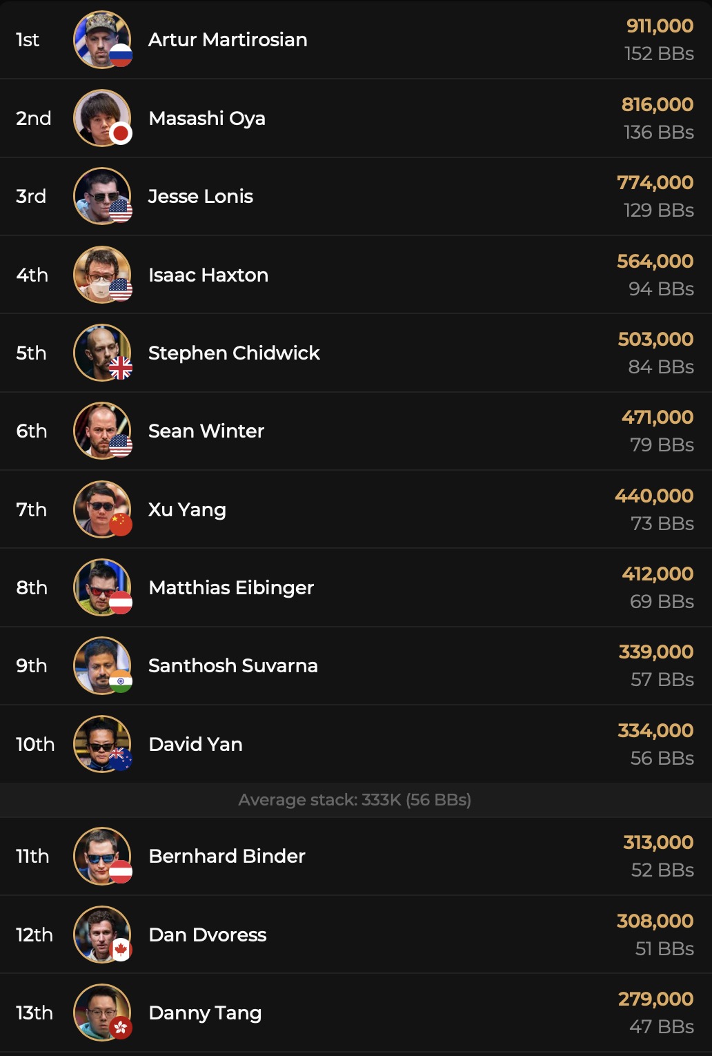 Die Spitzenpositionen im Zwischenklassement waren äußerst prominent besetzt: Als 5. tütete der britische Über-Spieler Stephen Chidwick 84 BBs ein, der immer noch sieglose Isaac Haxton kam als 4. auf 94 BBs, Jesse Lonis auf Rang 3 auf 129 BBs. Vor den beiden US-Amerikanern rangieren nur noch Masahi Oya aus Japan mit 136 BBs, und der Führende der Player-of-the-Year Wertung Artur Martirosian mit 152 Big Blinds. – Heute geht es um 13:00 Uhr Ortszeit bei Blinds 3.000/6.000-6.000 in Level 9 weiter.