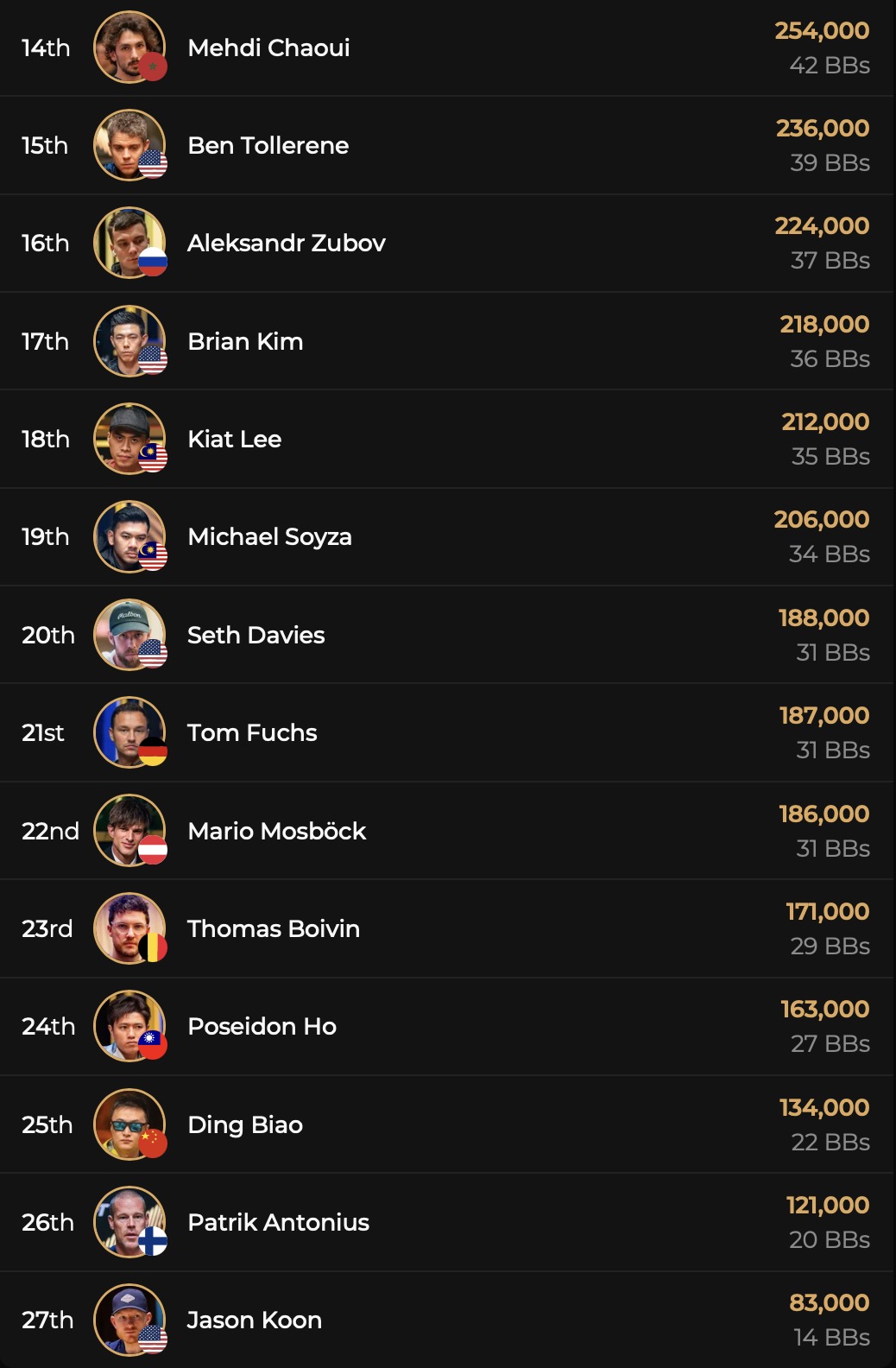 Während Spieler wie Alex Foxen oder Mikita Badziakouski an Tag 1 zu den Opfern gehörten, konnten Starter wie Jason koon (14 BBs), Ding Biao (22 BBs), Michael Soyza (34 BBs), oder Anthosh Suvarna (57 BBs) Chips für Tag 2 eintüten.