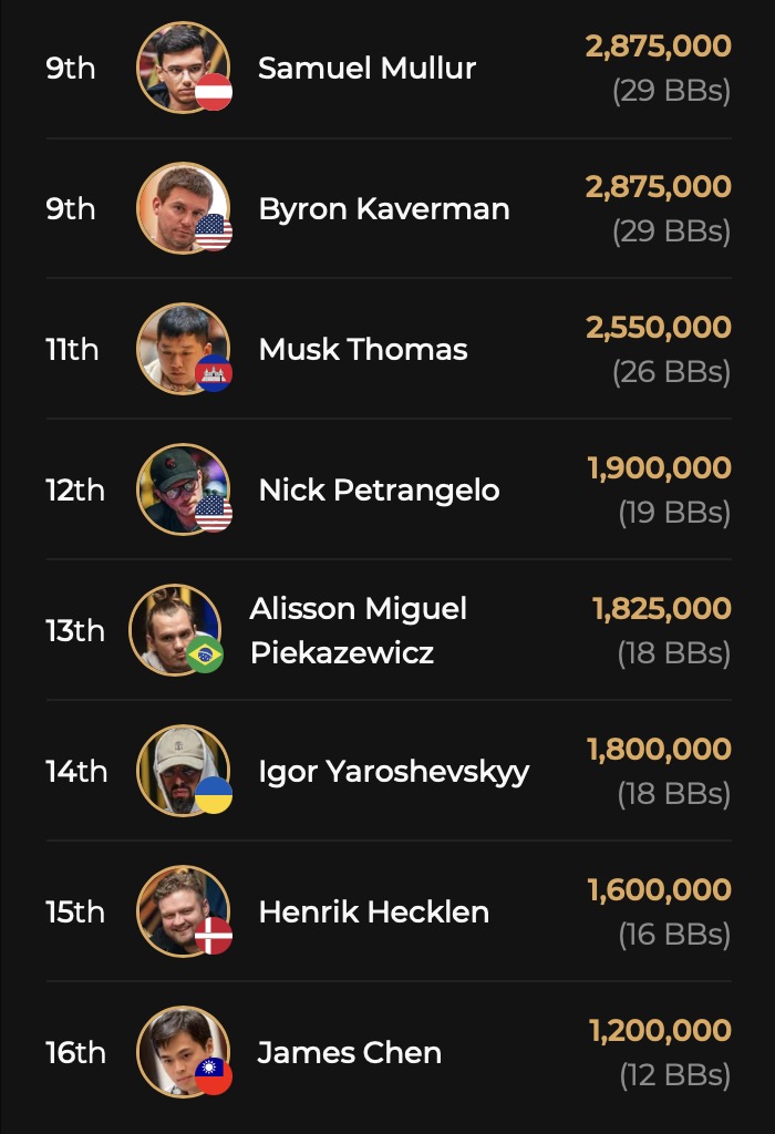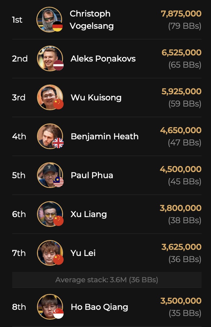Weiter mit von der Partie sind dagegen der Sieger des letzten Triton ONE Events Samuel Mullur auf Rang 9 mit 29 BBs und Christoph Vogelsang. Der Deutsche hat von allen verbleibenden 16 Spielern als Chipleader die größte Chance auf den Sieg. Ganze 79 BBs umfasst sein Stack zum Start von Tag 3. Sein nächster Verfolger, der lettische SHR Reg Aleks Ponakovs, folgt mit etwas Respektabstand und 65 BBs. Auf Rang 3 liegt der Chinese Wu Kuisong mit 59 BBs, gefolgt von Ben Heath aus Großbritannien mit 47 und Paul Phua mit 45 BBs.