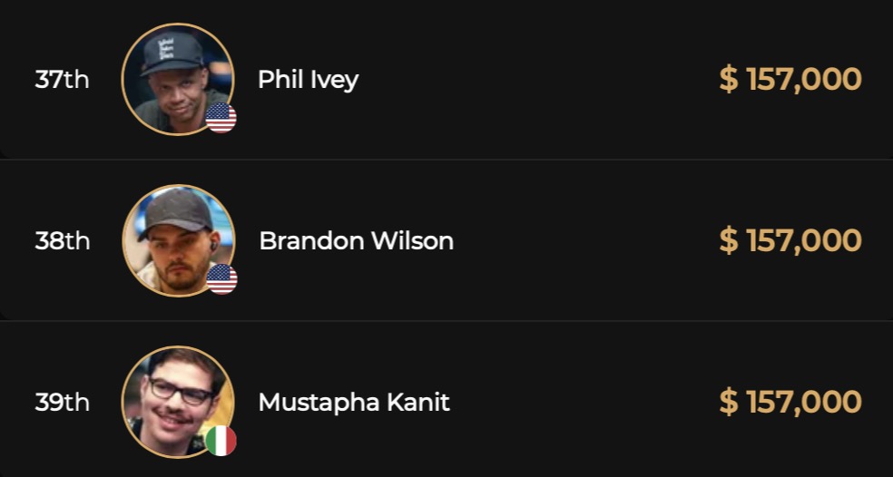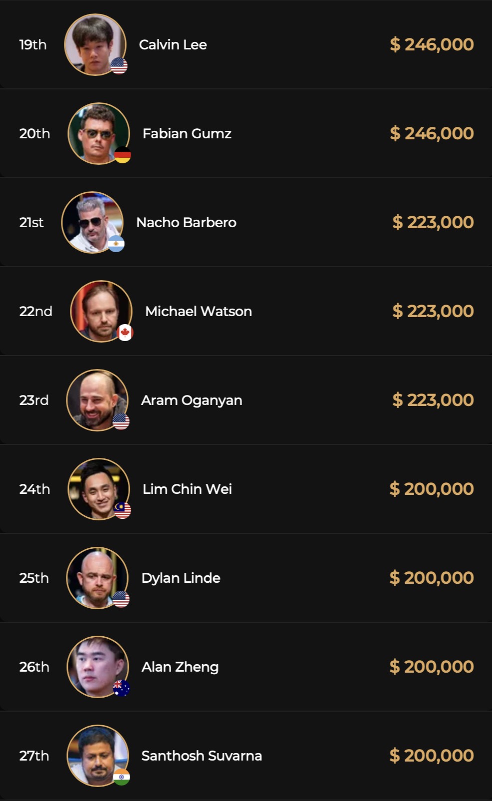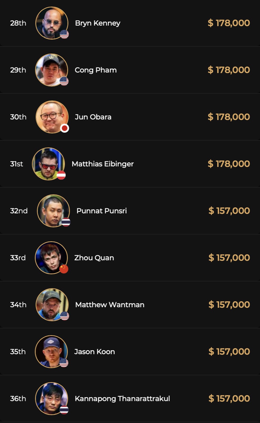 Internationale Pokercracks wie Mustapha Kanit (39., $157.000), Phil Ivey (37., $157.000), Jason Koon (35., $157.000), Punnat Punsri (32., $157.000), Bryn Kenney (28., $178.000), Santhosh Suvarna (27., $200.000), Nacho Barbero (21., $223.000) oder die beiden frischgekürten Triton Jeju 2025 Champs Jonathan Jaffe (18., $246.000) und Richard Yong (17., $280.000) mussten ihre Plätze an Tag 2 ohne Chiptüte verlassen.