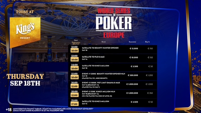 An Tag 1 der World Series of Poker Europe (WSOPE) im King’s Resort Rozvadov wurde neben dem €1.200 Bounty Hunter Opener (#1) auch der erste von sechs Starttagen in der €350 King’s Million (#2) ausgespielt, die die namensgebende Garantie von €1.000.000 besitzt. 28 Spieler der 182 Entrys erreichten bereits das Preisgeld. Nach 18 Leveln waren noch 15 der 182 Entrys an den Tischen, die ihre Stacks für Tag 2 eintüten. Den Chiplead hatte am Ende ein deutscher Spieler inner.