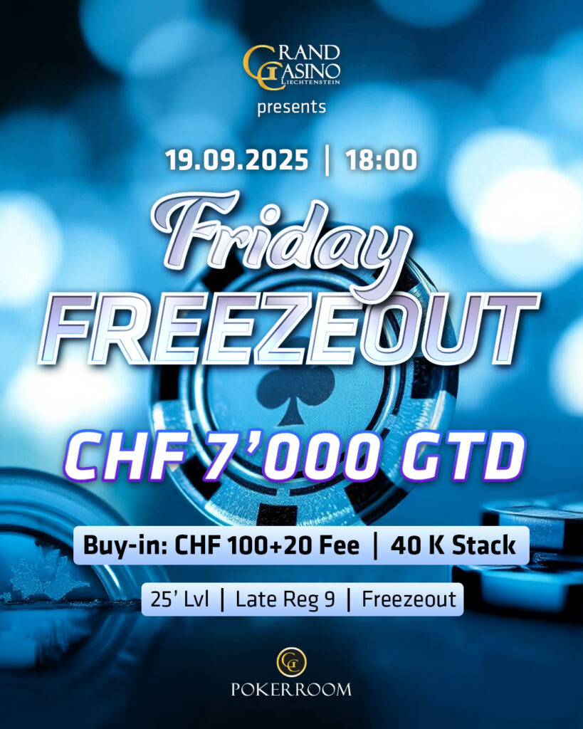 Heute geht es im Grand Casino Liechtenstein um 18:00 Uhr weiter mit dem CHF 120 Friday Freezeout. Gespielt wird mit einer CHF 7.000 Garantie, einem 40.000 Start Stack und 25 Minuten Blind Levels.