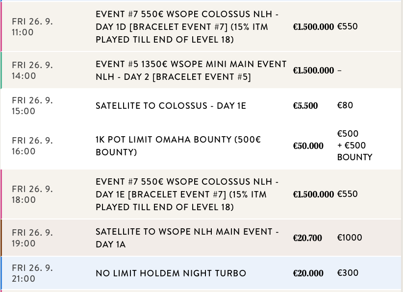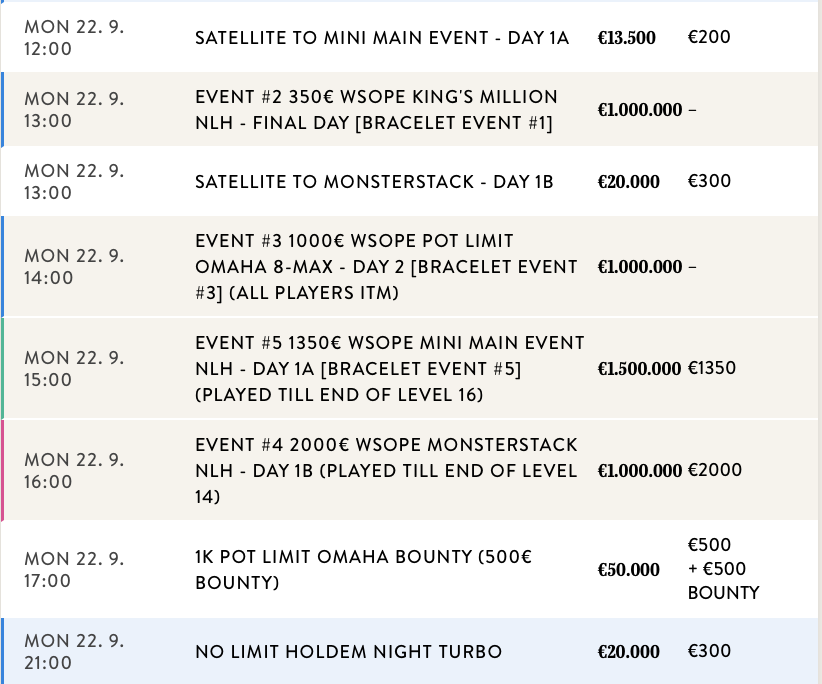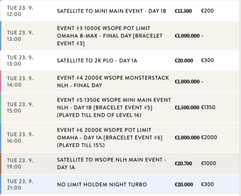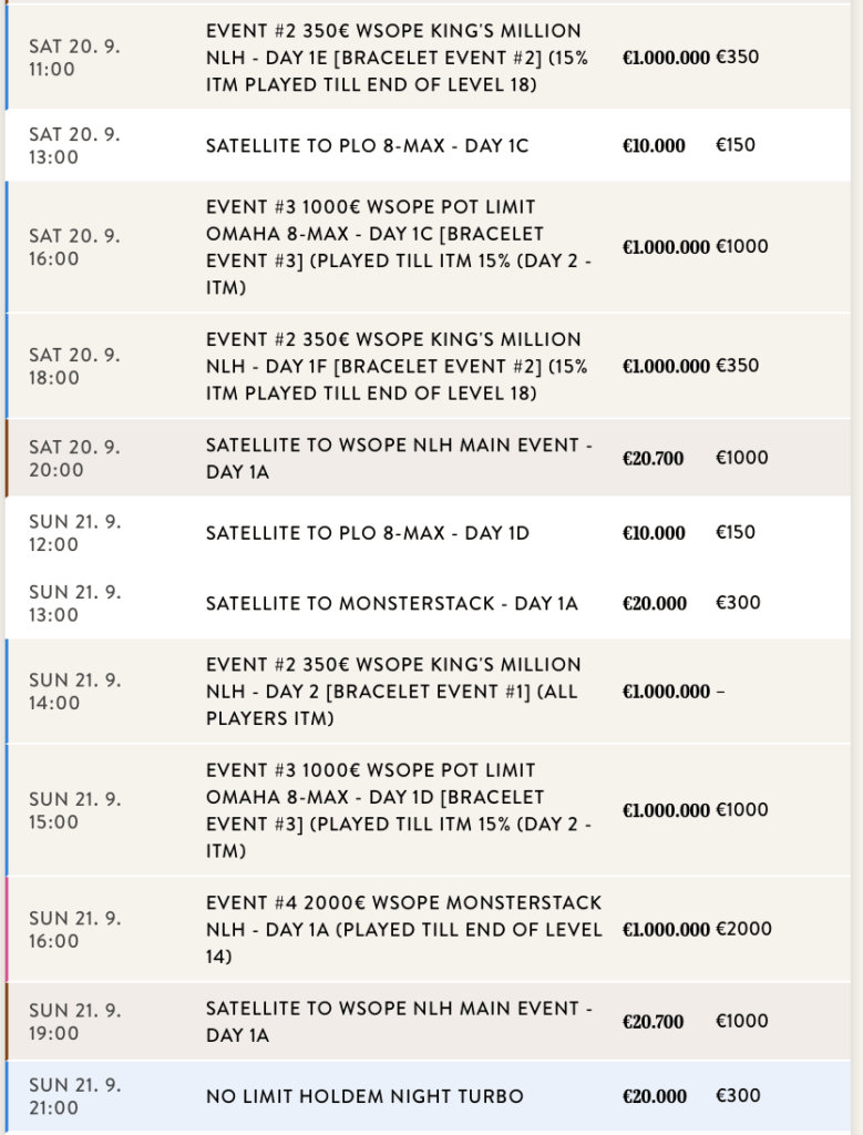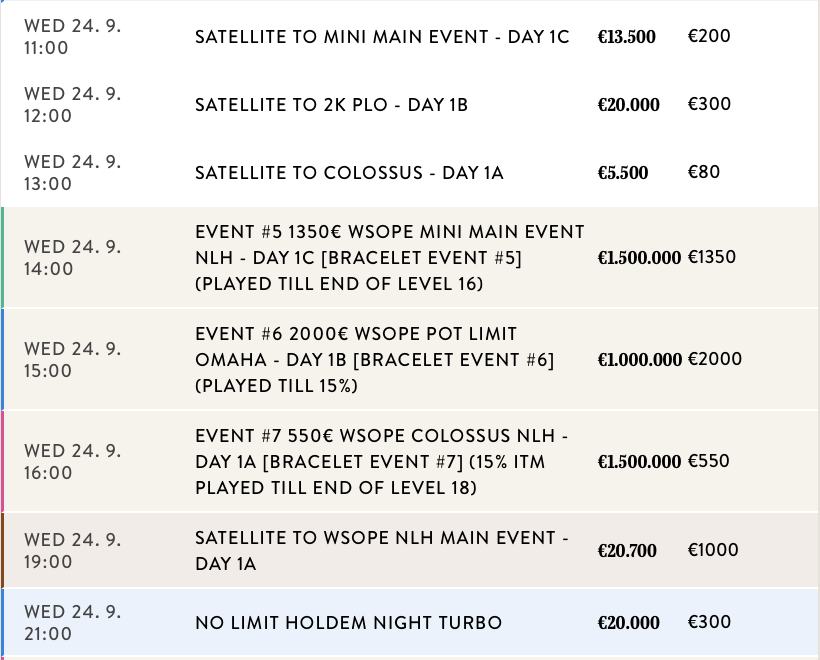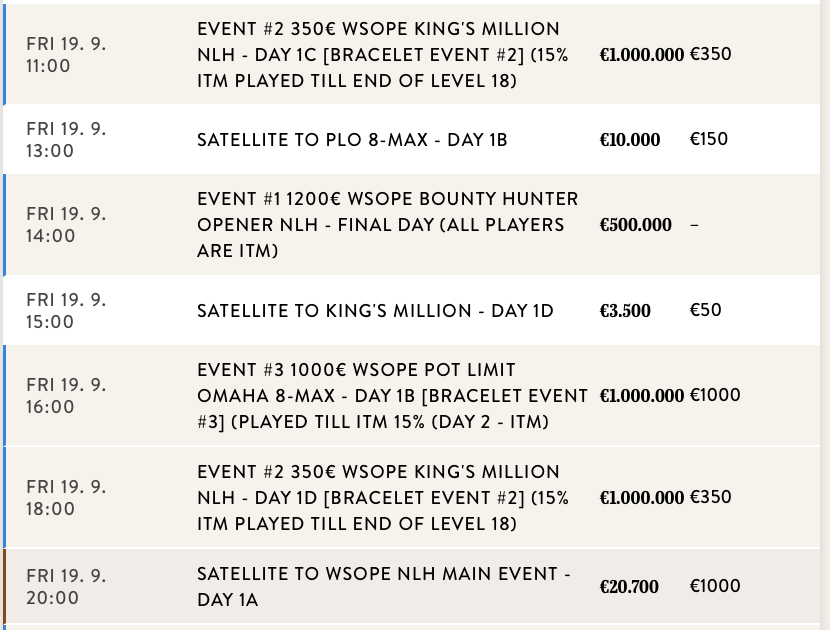 €400 aus dem Buy-in wurden dem Bounty-Preispool zugewiesen, welcher ab heute im Finale ausgespielt wird. In dem garantierten €500.000 Preispool sind auch fünf WSOPE Main Event Tickets im Wert von je €10.350 enthalten.