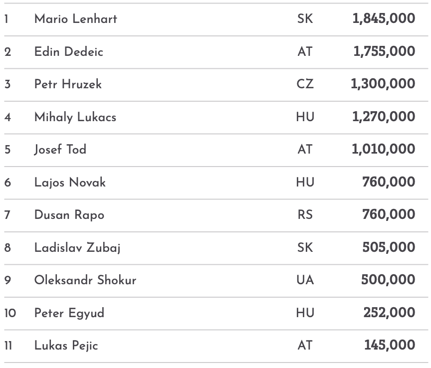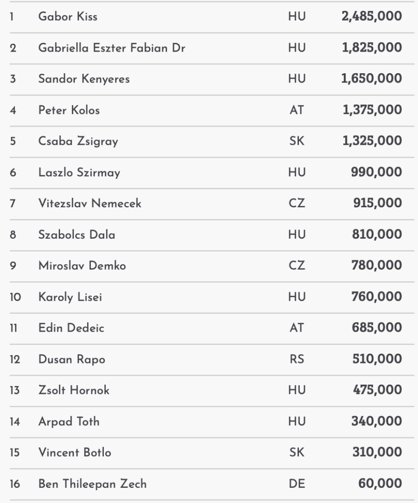| 1B | 79 | 8 | Roland Lakatos (HUN): 1.455.000 |