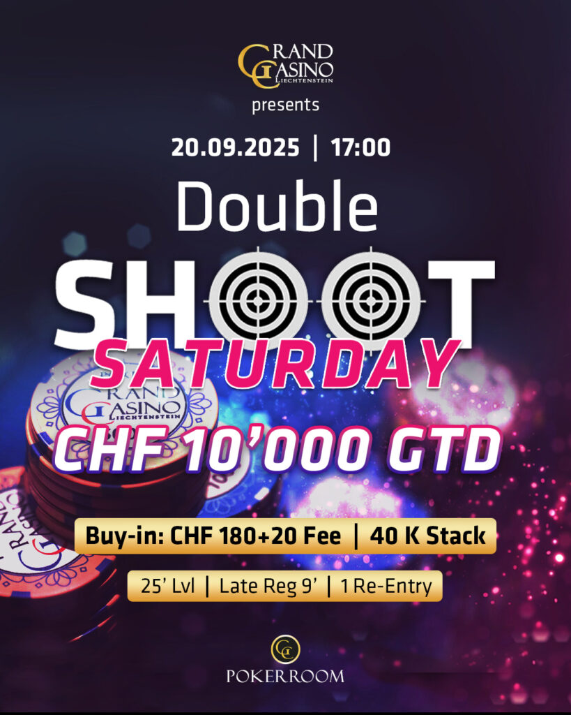 Heute geht es im Grand Casino Liechtenstein um 18:00 Uhr weiter mit dem CHF 180+20 Double Shoot Saturday. Gespielt wird mit einer CHF 10.000 Garantie, einem 40.000 Start Stack und 25 Minuten Blind Levels.