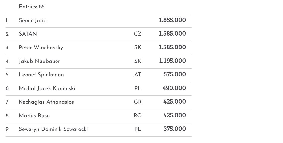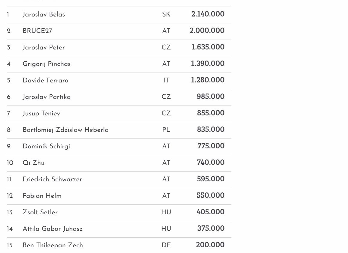 1A | 116 | 12 | Karol Masarovic (SVK): 1.935.000 |