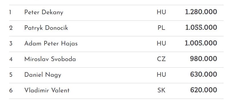 1H | 56 | 6 | Peter Dekany (HU) 1.280.000 |