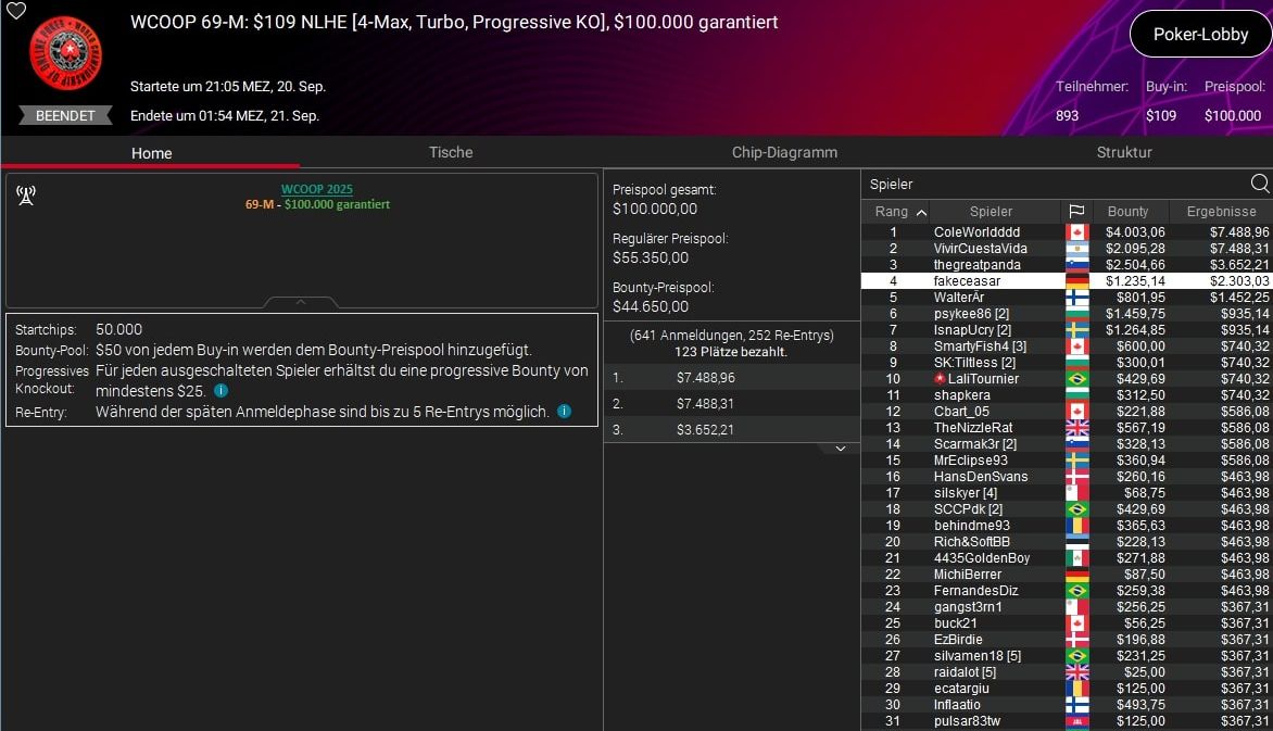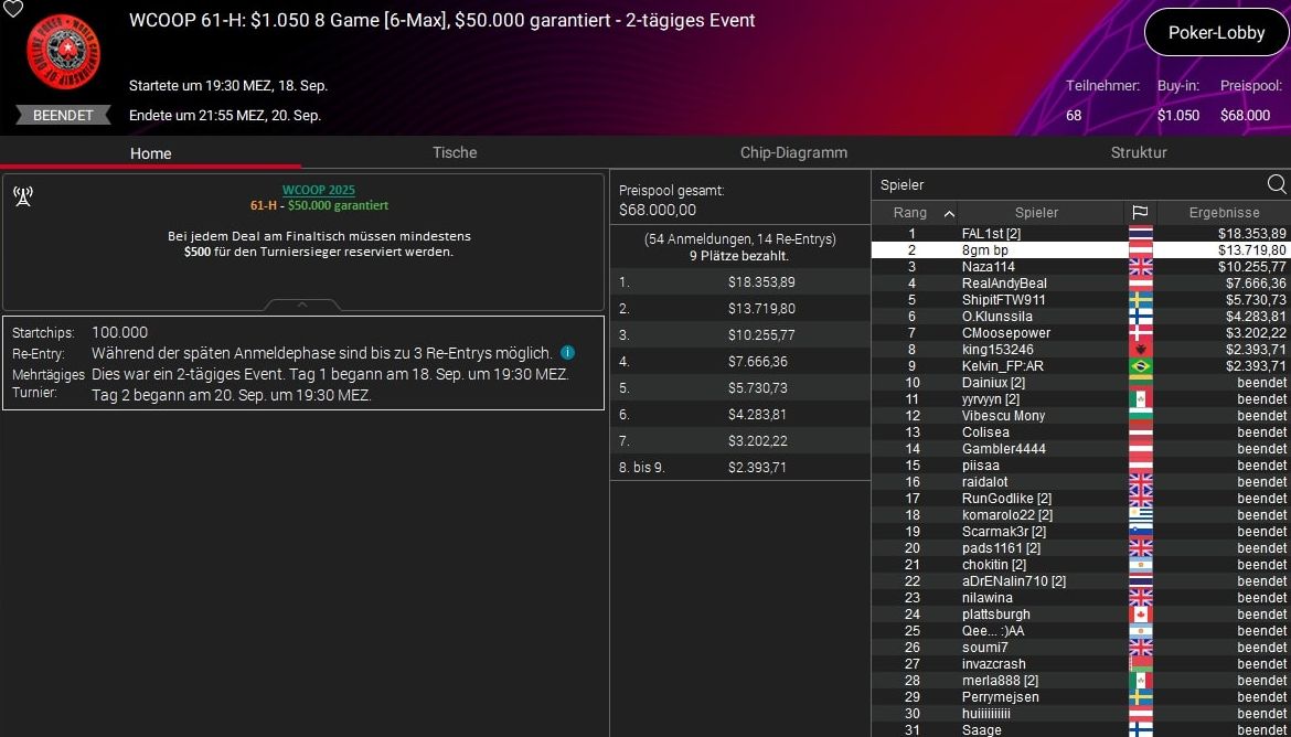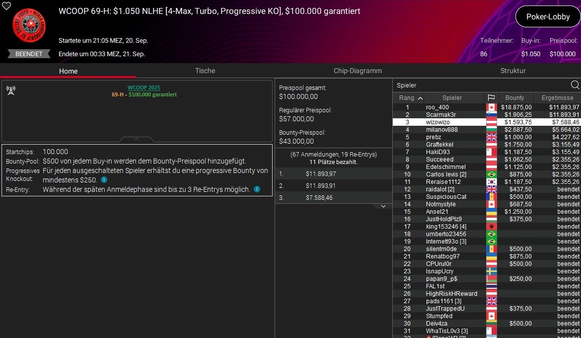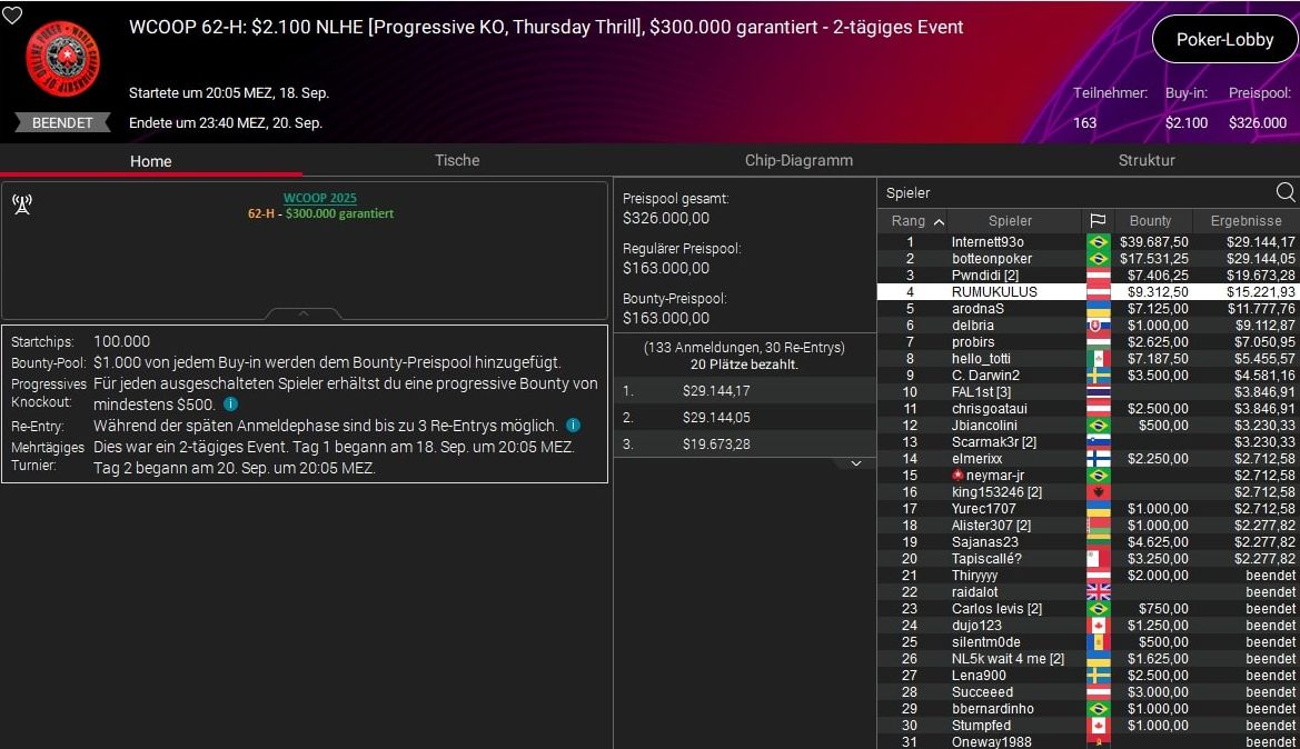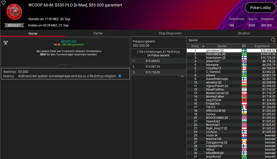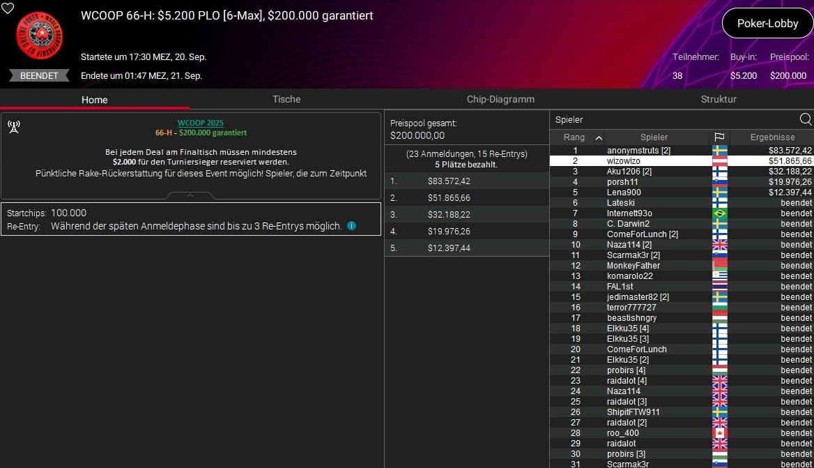 Besonders lukrativ war der zweite Platz bei Event #66-H, einem $5.200 PLO 6-max, der rund $52.000 Preisgeld einbrachte.