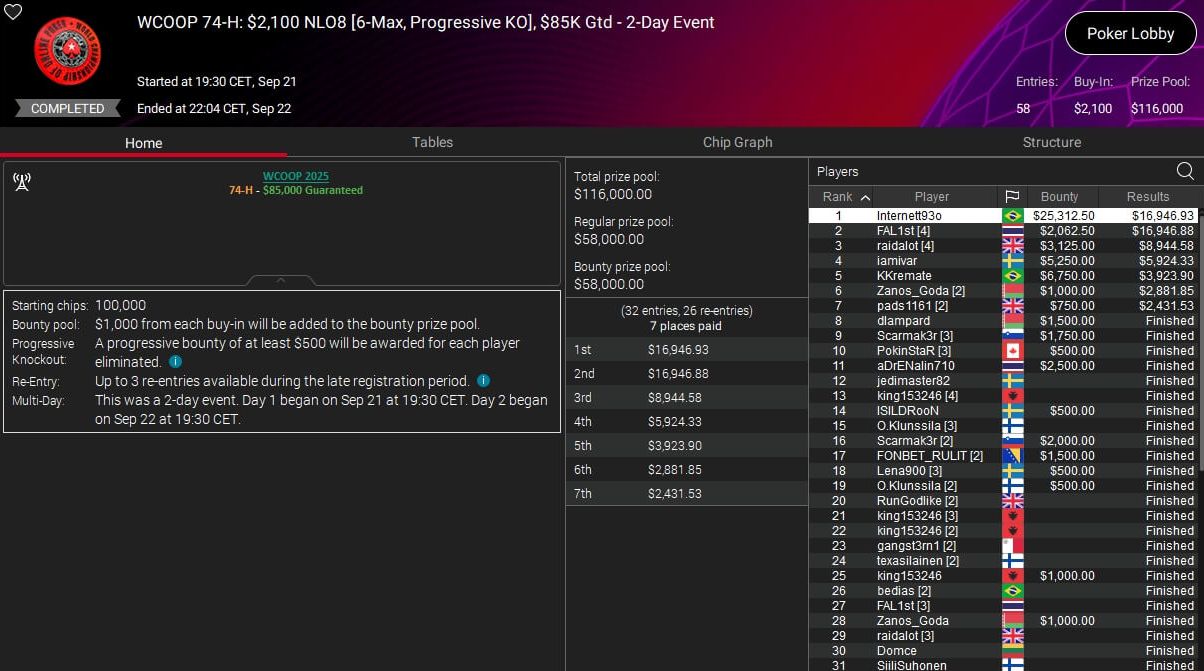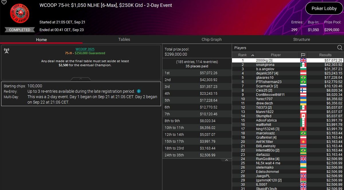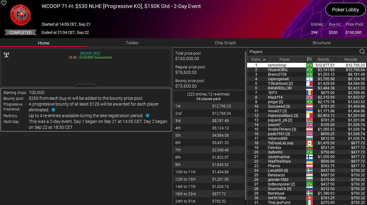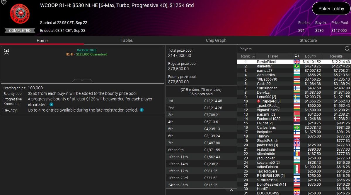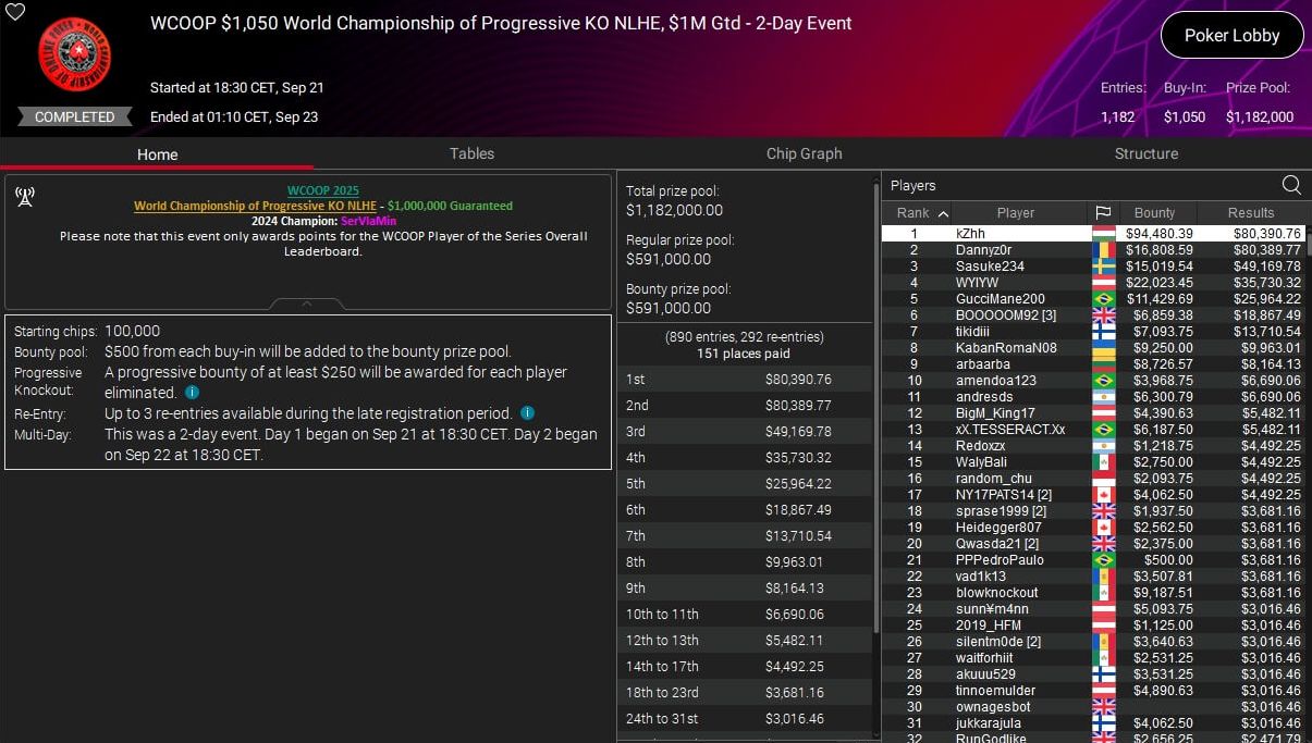Ein Höhepunkt war die $1.050 World Championship NLHE PKO, an der sich 1.182 Entrys beteiligt hatten. Für die DACH-Community holte „WYIYW“ einen starken vierten Platz, der Sieg samt rund $178.000 ging an den Ungarn „kZhh“.