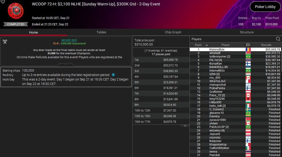 Zu den Siegern am Montag gehörte auch Juan „MalakaStyle“ Pardo, der das Event 72-H, das $2.100 Sunday Warm-Up für sich entschied.