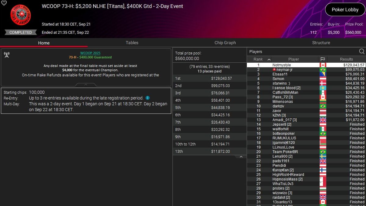 | Wed | 13:05 | WCOOP 121-H: $530 NLHE [Final][Mystery], $125K Gtd |