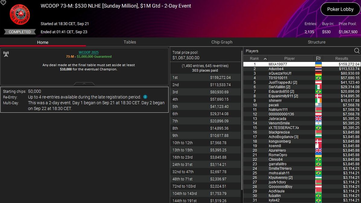 85 Spieler machten den Sieg bei der $530 Sunday Million (Event 73-M) untereinander aus. Mit „sQuezzeYoU!!“ aus Deutschland landete ein Spieler aus der DACH-Community auf einem starken dritten Platz und kassierte über $80.000. Den Sieg sicherte sich „“MIXA19977“ aus der Ukraine, der über knapp $160.000 Preisgeld jubeln durfte.