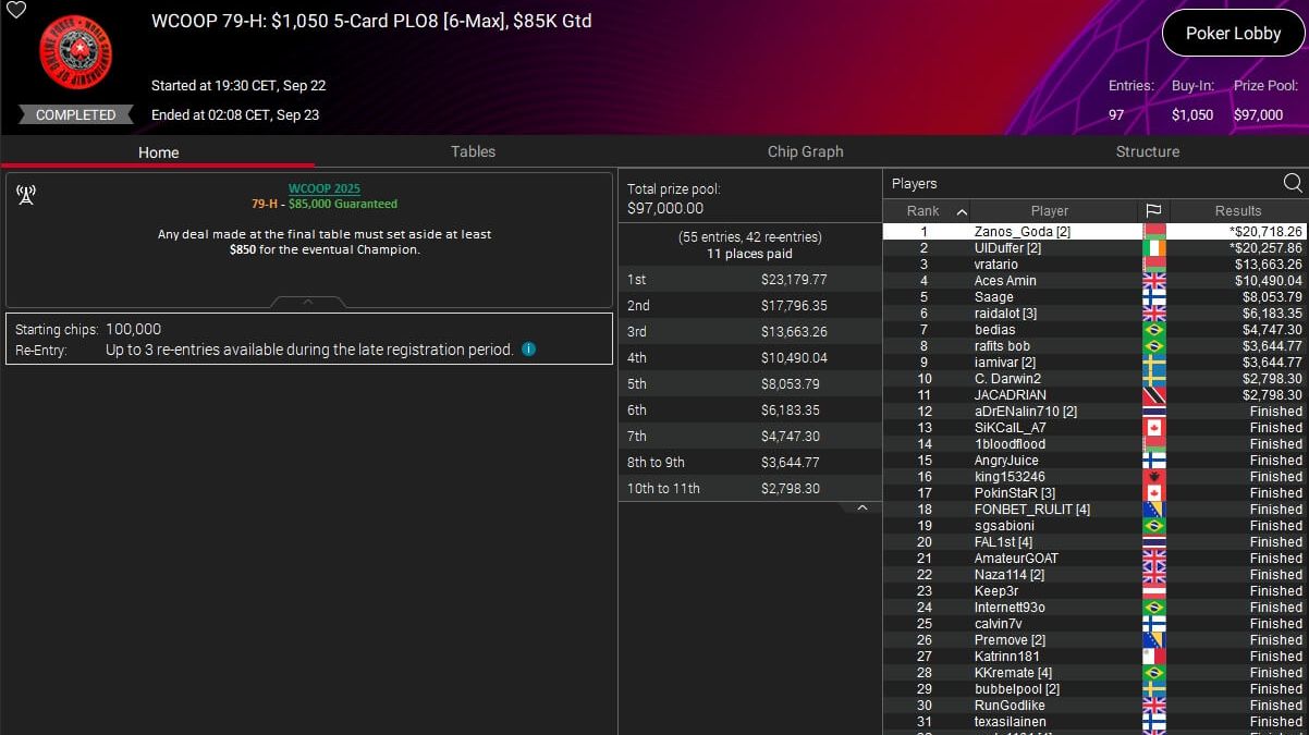 | Sun | 15:05 | WCOOP 111-H: $10,300 PLO [PLO][Main][Event][/][World][Championship], $500K Gtd |
