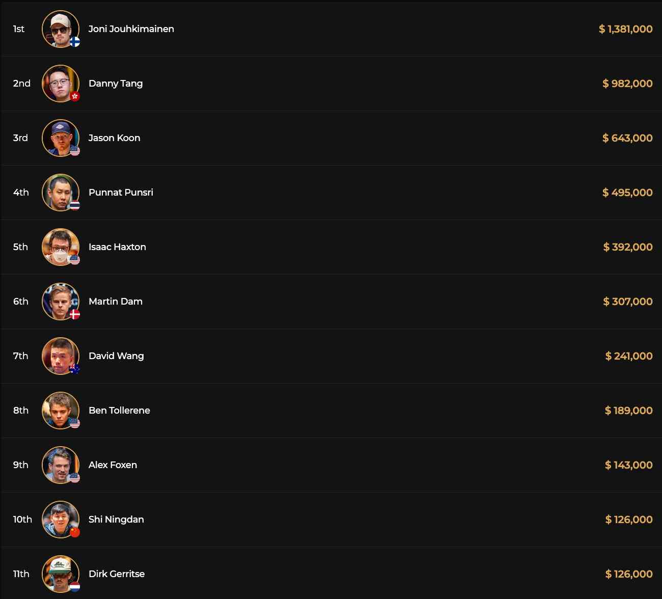 Im Heads-Up trafen der Finne Joni Jouhkimainen und Danny Tang aus Hongkong aufeinander. Jouhkimainen konnte sich durchsetzen und $1.381.000 abstauben. Runner-Up Tang ging mit $982.000 aus dem Turnier.