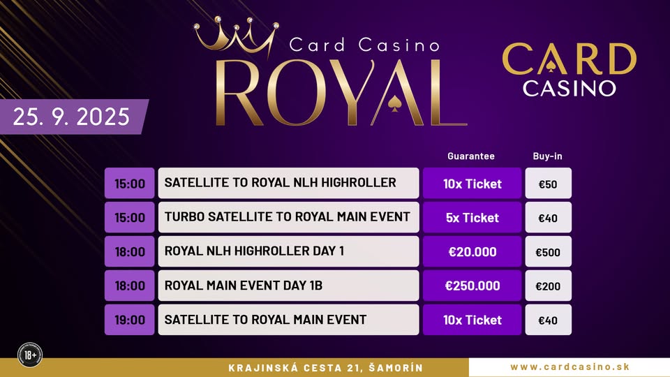 Im Card Casino Samorin begann gestern das €200 Royal Turnier mit dem ersten von acht Starttagen. Das beliebte Royal-Festival läuft vom 23. bis 29. September und garantiert allein beim Main Event ein Preisgeld von €250.000.