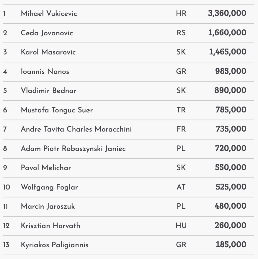 | 1A | 126 | 13 | Mihael Vukicevic (HR): 3.360.000 |