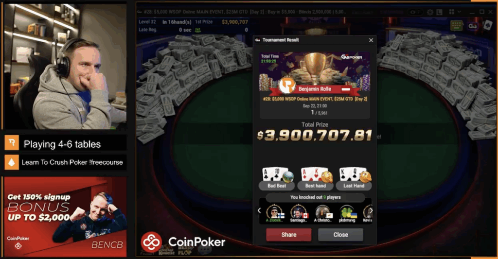 Und der Sieger sollte niemand Geringerer sein als der deutsche Poker-Profi und CoinPoker-Ambassador Benjamin ‚bencb789‘ Rolle. Rolle ist der Gründer von Raise Your Edge, einer Poker-Coaching-Website, die Strategien, Training und kostenlose Ressourcen für Spieler anbietet, die ihr Spiel verbessern möchten. Außerdem streamt er Poker online und teilt seine Hände und Erkenntnisse mit seinen Followern. Mit diesem Sieg fügt er seinem Lebenslauf einen weiteren großen Turniersieg hinzu und beweist damit die Wirksamkeit seiner eigenen Strategien auf höchstem Niveau des Online-Pokers.