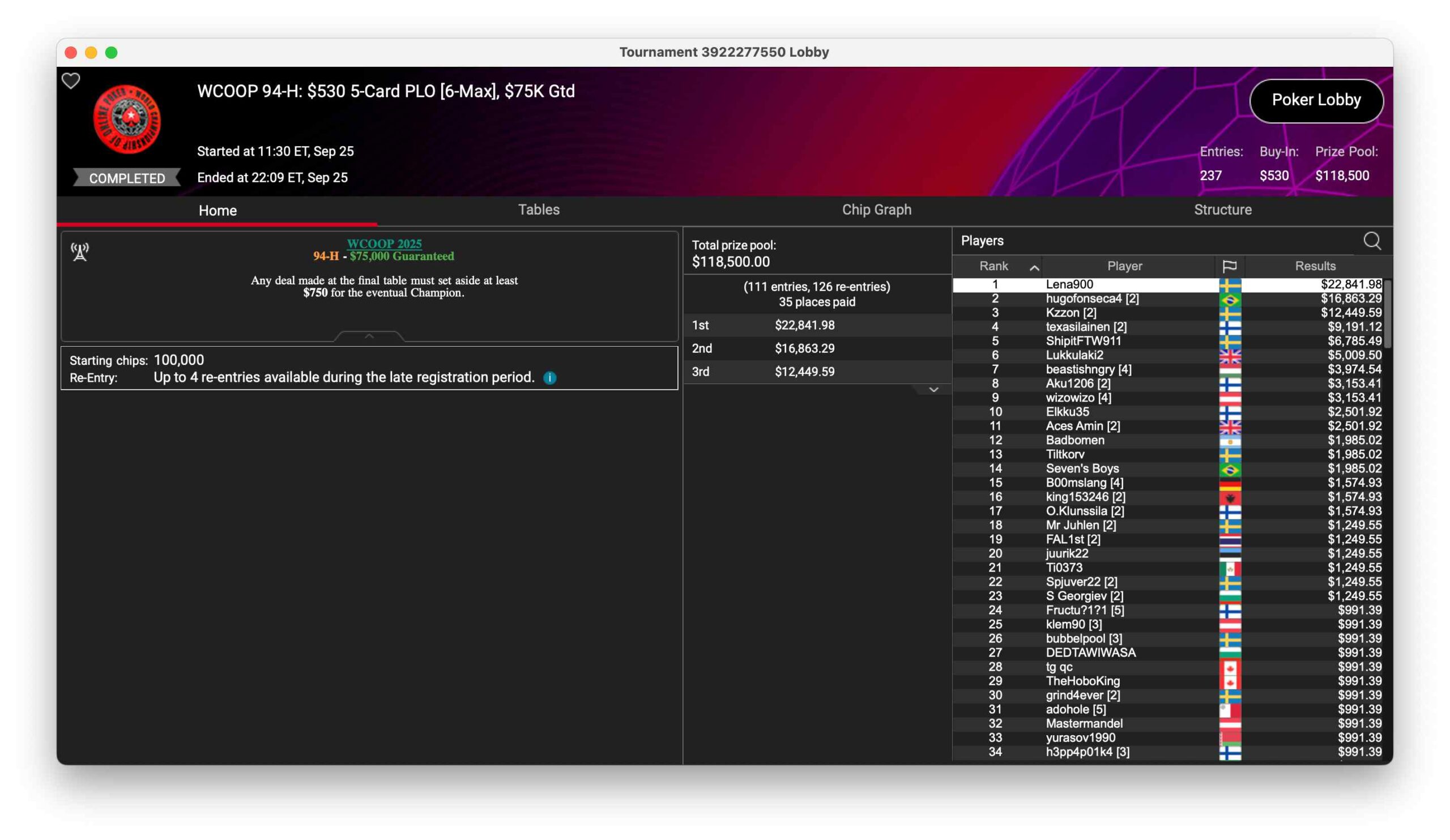 Im $530 5-Card PLO waren 237 Entries am Start. $118.500 häuften sich dadurch im Preispool an. Den Sieg holte Online-Legende Niklas „Lena900“ Astedt für $22.841.