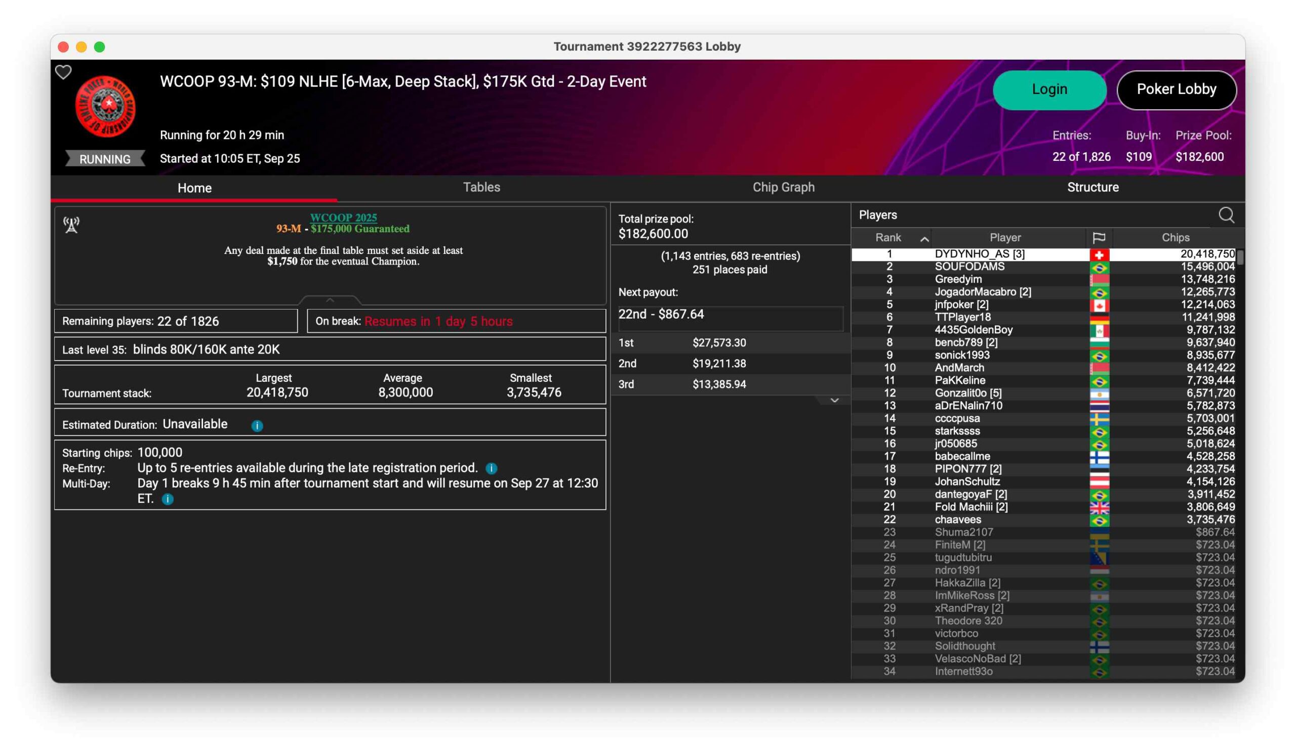 | Mon | 15:05 | WCOOP 116-H: $5,200 NLHE [Turbo,][ME][2nd][Chance], $250K Gtd |