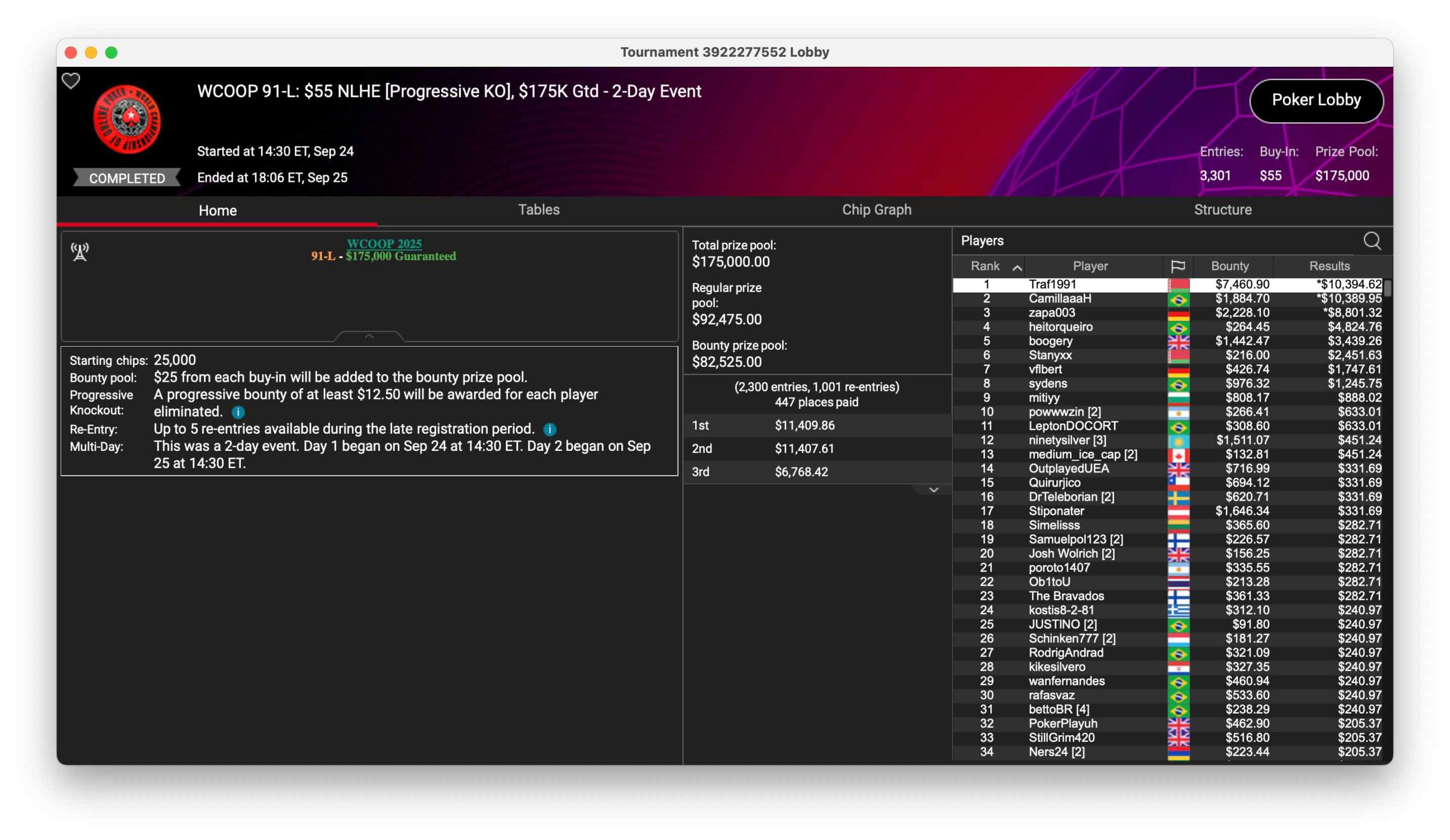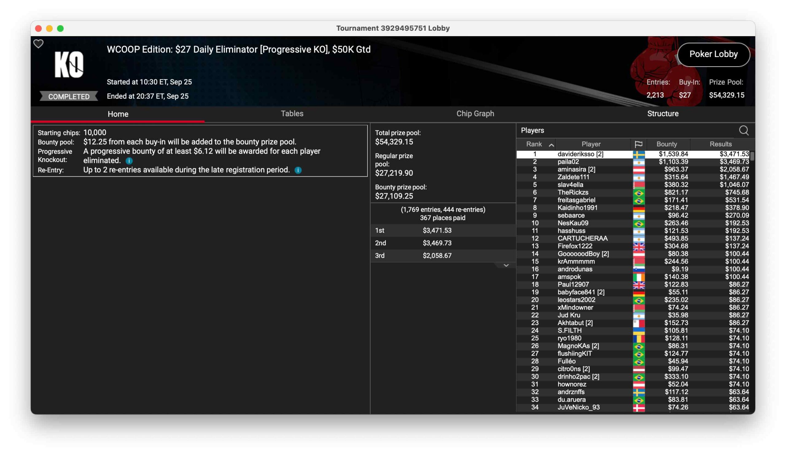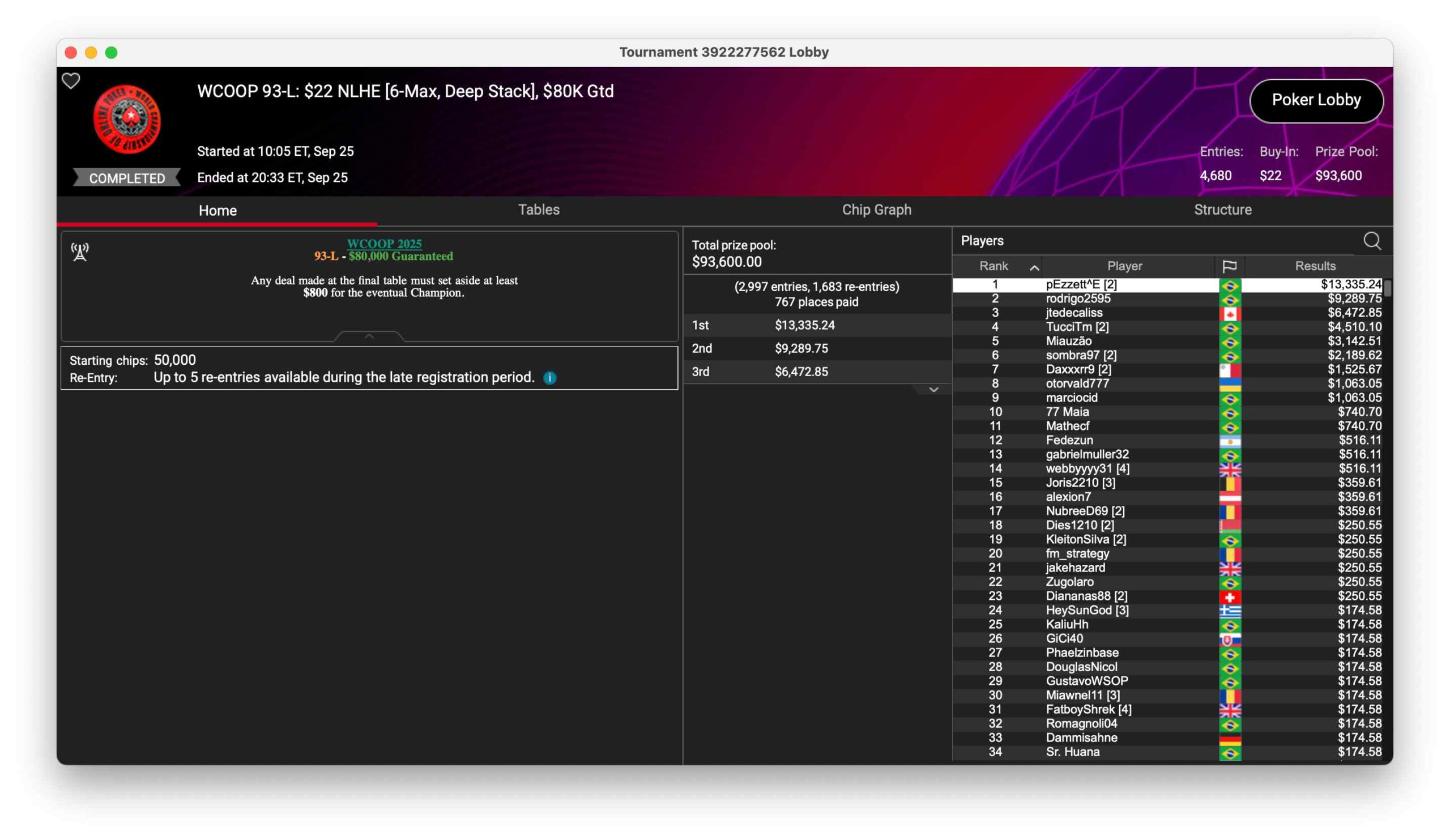 | Mon | 15:05 | WCOOP 116-L: $55 NLHE [Turbo,][Mystery][Bounty,][ME][2nd][Chance], $200K Gtd |