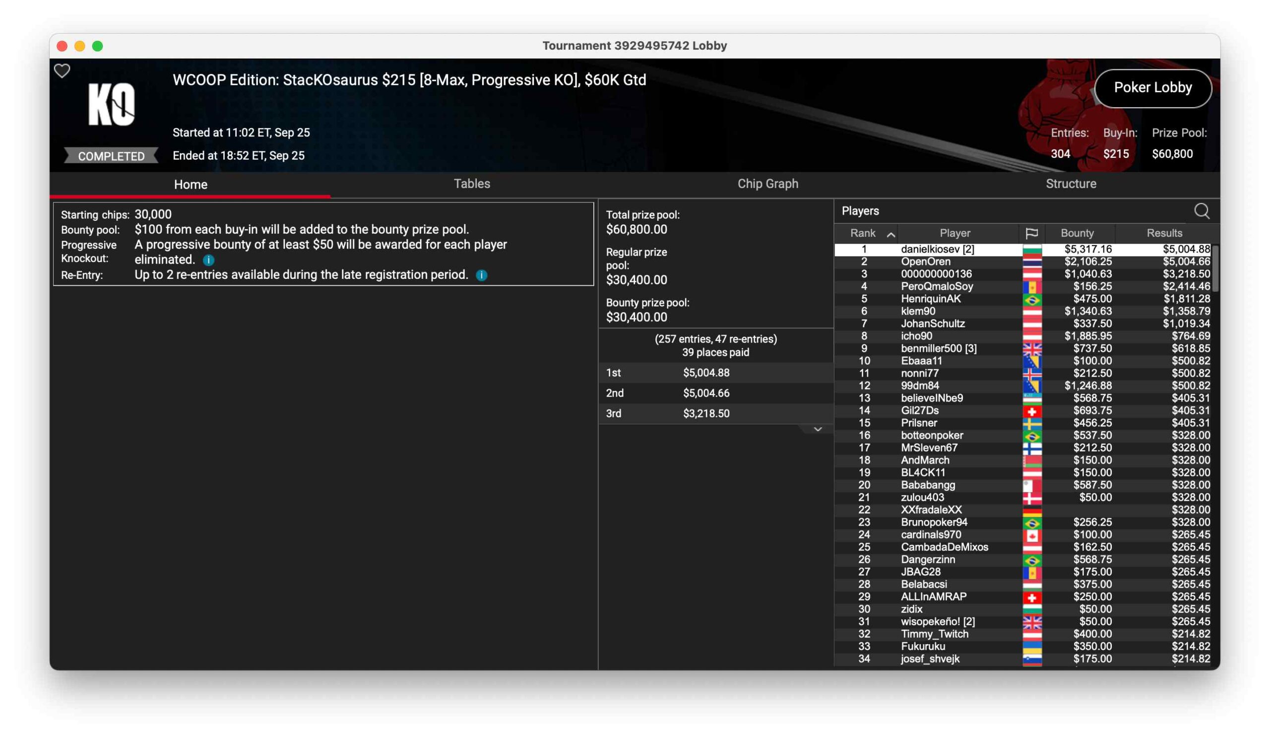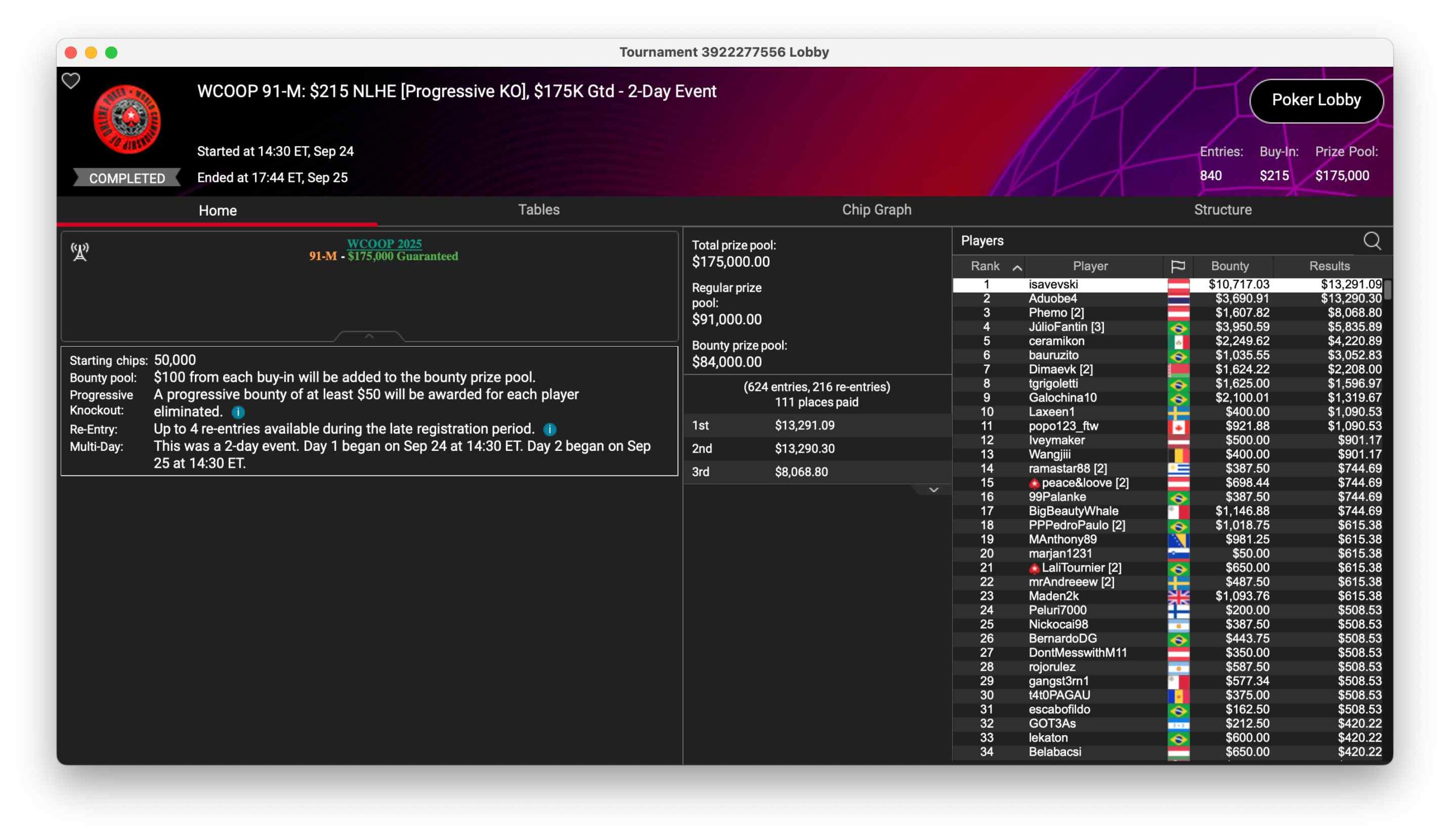 Das $215 NLHE PKO hatte 840 Entries und aus der Garantie inklusive Overlay einen $175.000 Preispool. Ilija „isavevski“ Savevski aus Nordmazedonien gewann unter österreichischer Flagge das Turnier für $10.717 + $13.291.
