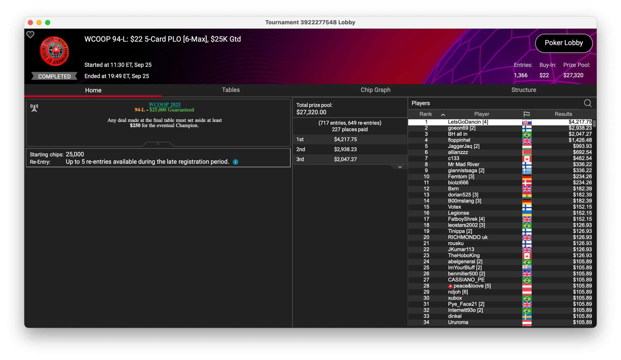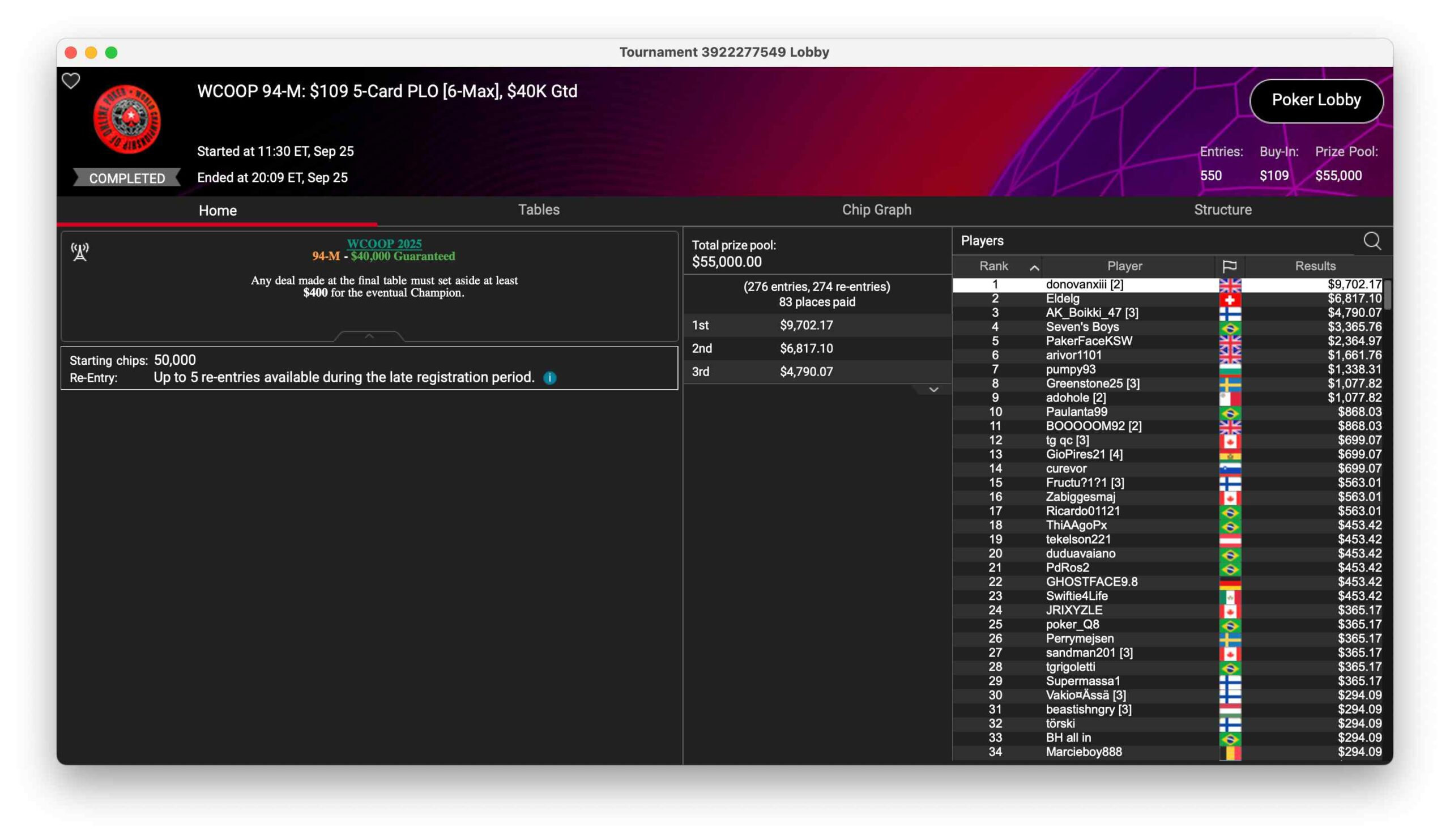 Das $109 5-Card PLO 6max mit 550 Entries und $55.000 Preispool gewann der Brite „donovanxiii“ für $9.702. Runner-Up wurde der Schweizer „Eldelg“ für $6.817.
