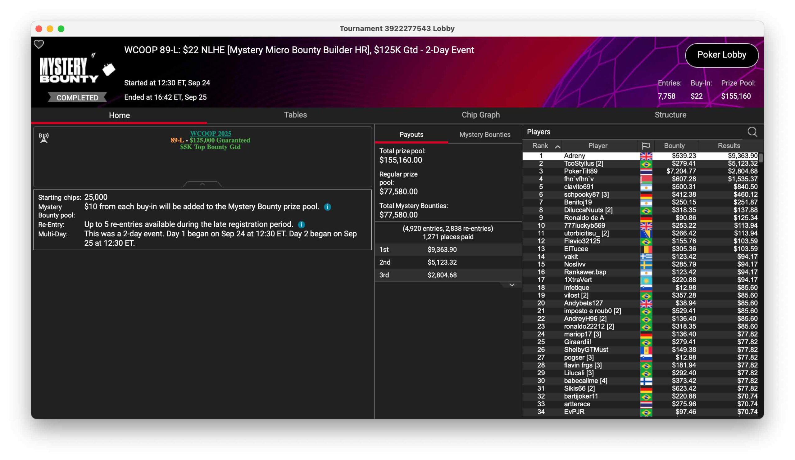 | Wed | 13:05 | WCOOP 121-H: $530 NLHE [Final][Mystery], $125K Gtd |