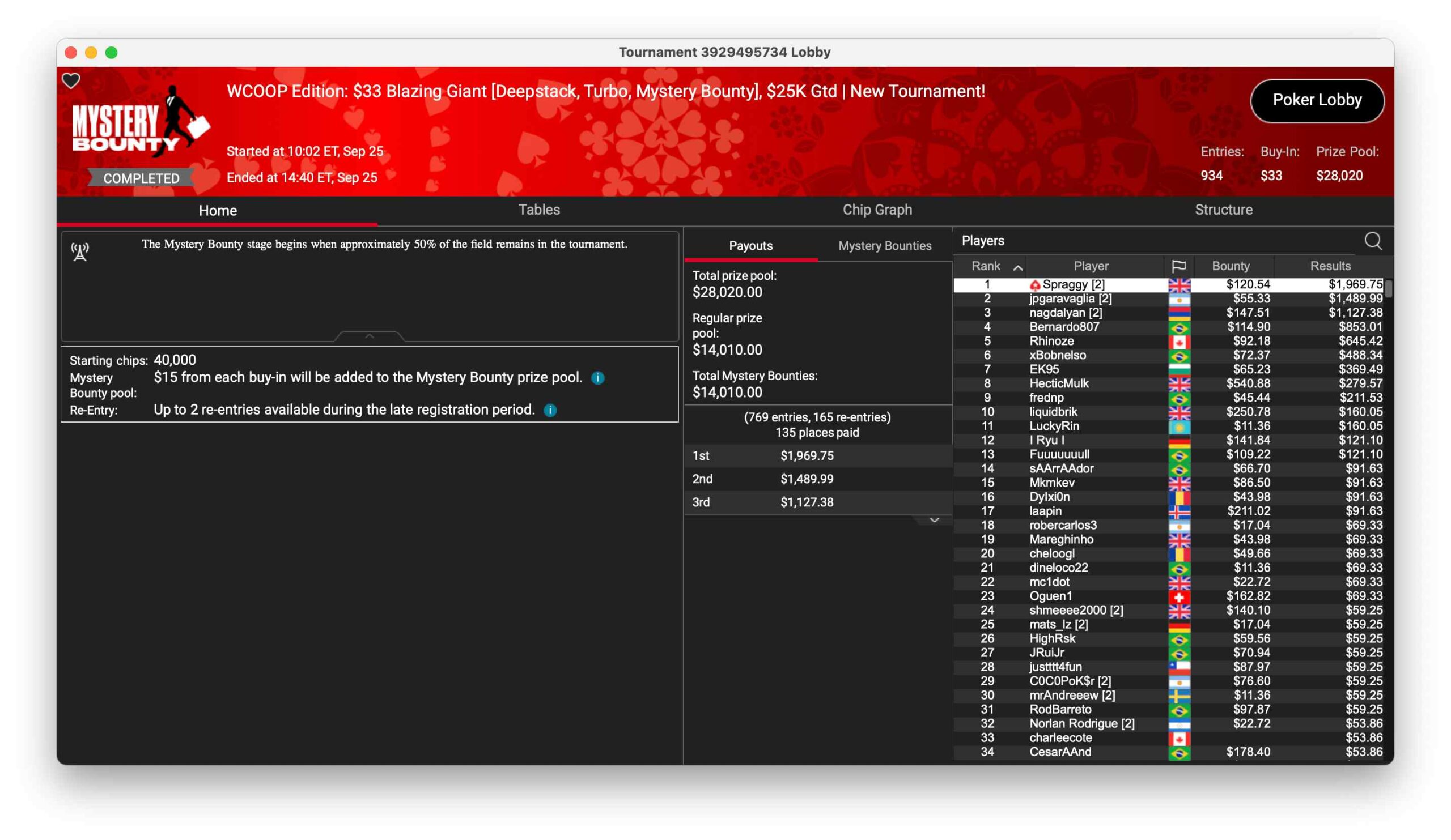 PokerStars-Pro und Streamer Benji „Spraggy“ Spragg holte den Sieg im $33 Blazing Giant für $120 + $1.969. 934 Entries hatte das Turnier mit $28.020 Preispool.