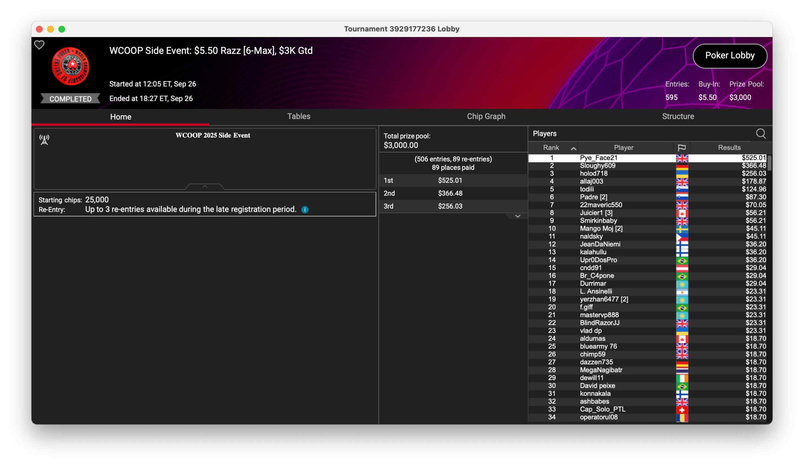 148 Entries gab es im $55 Razz, die für einen $7.400-Preispool sorgten. „Ac-King00“ aus Österreich holte den Sieg für $1.561.