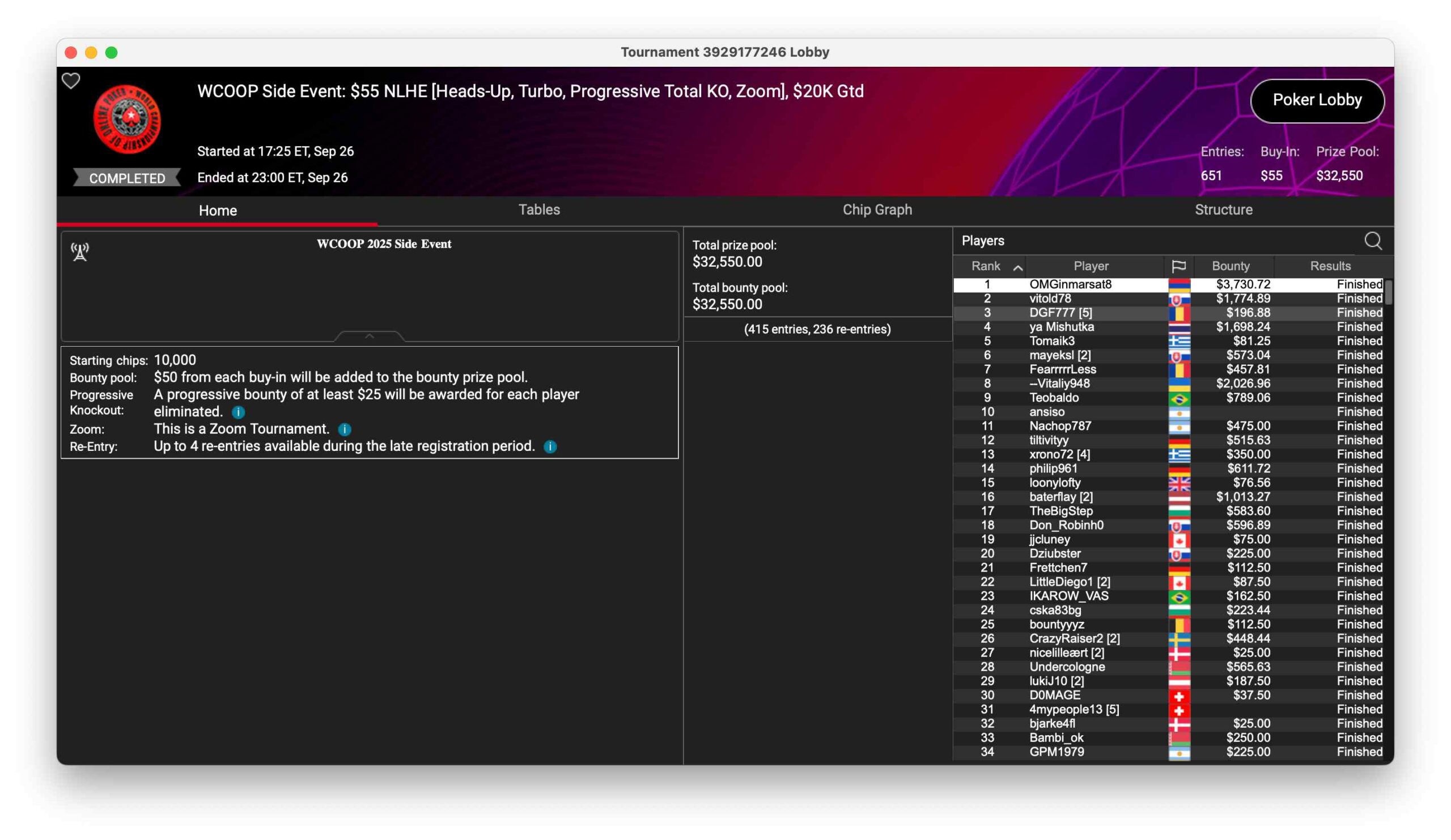 Das $55 NLHE Heads-Up Turbo PKO Total KO Zoom mit 651 Entries hatte $32.500 Preispool. Der Sieg ging nach Rumänien an „OMGinmarsat8“ mit $3.730 Bounties.