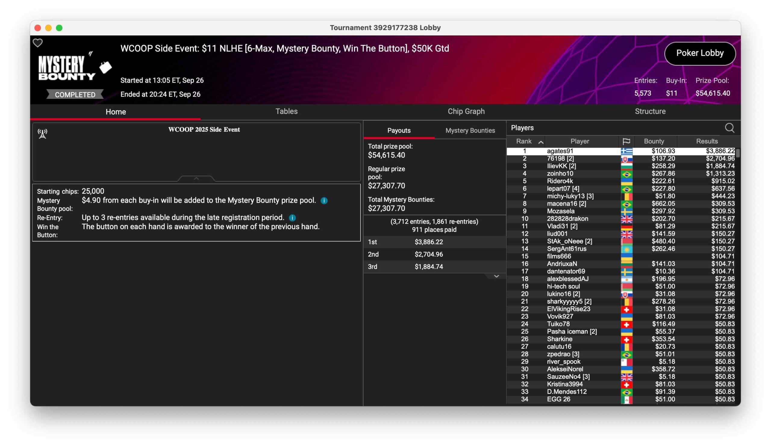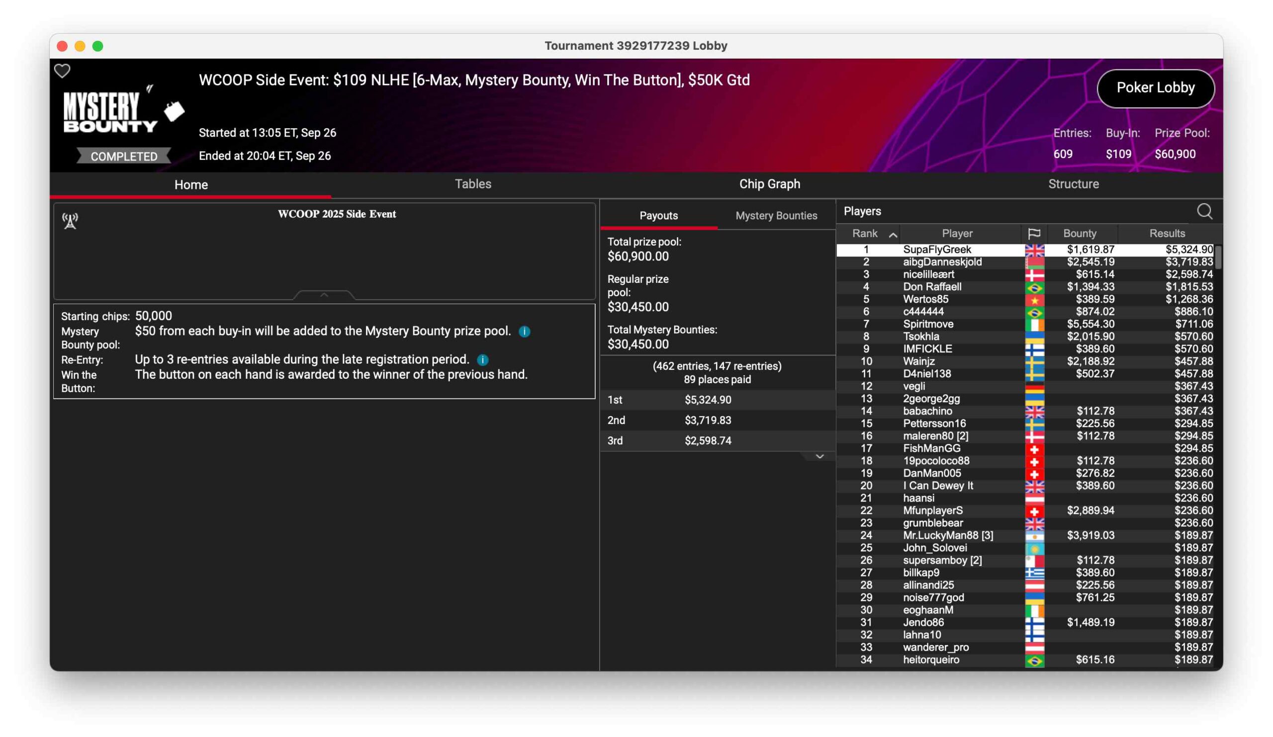 Das größte Turnier des Tages war das $109 NLHE 6max Mystery Bounty Win The Button mit 609 Entries und $60.900 Preispool. Platz 1 ging an den Briten „SupaFlyGreek“ für $1.619 + $5.324.
