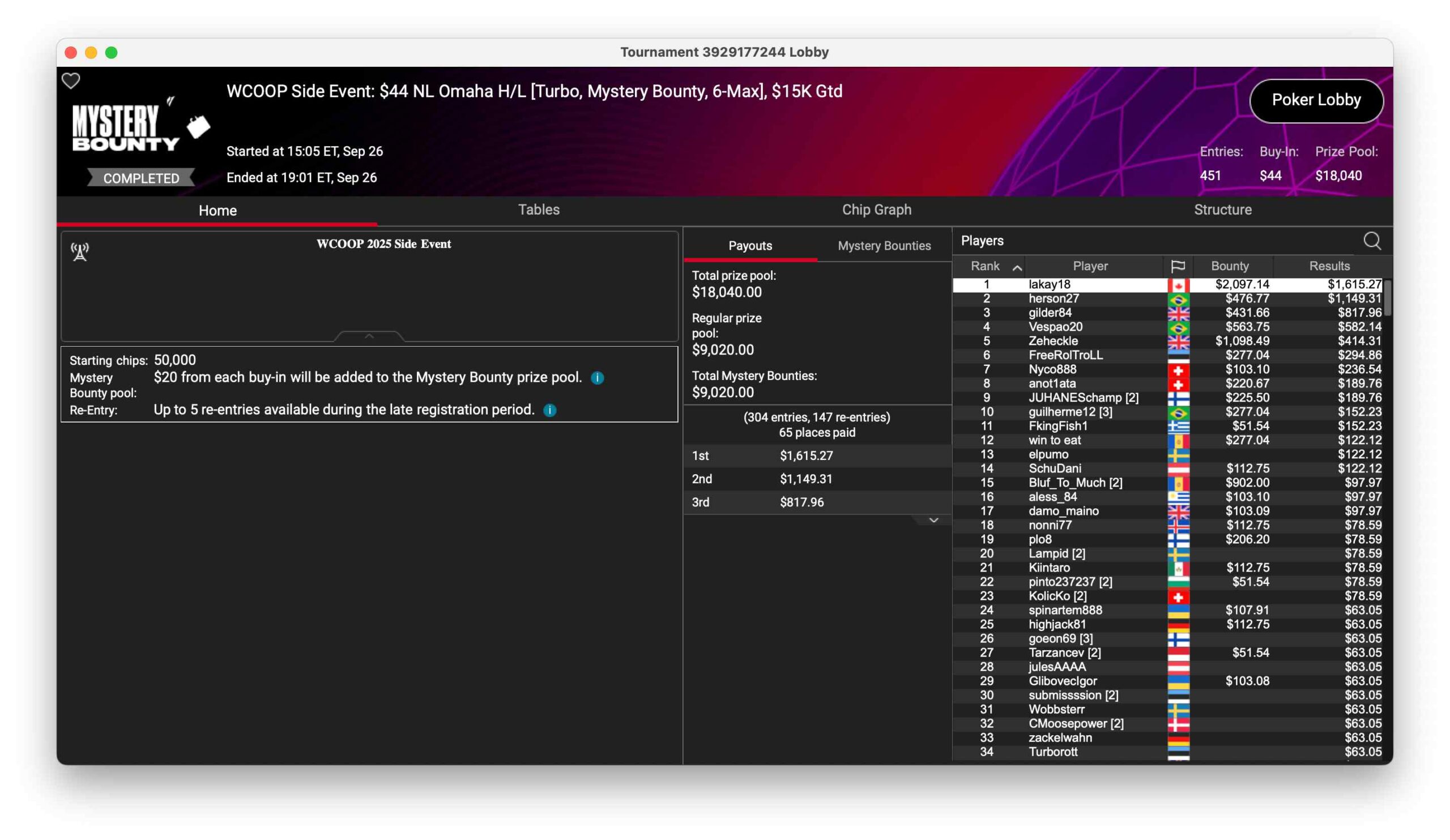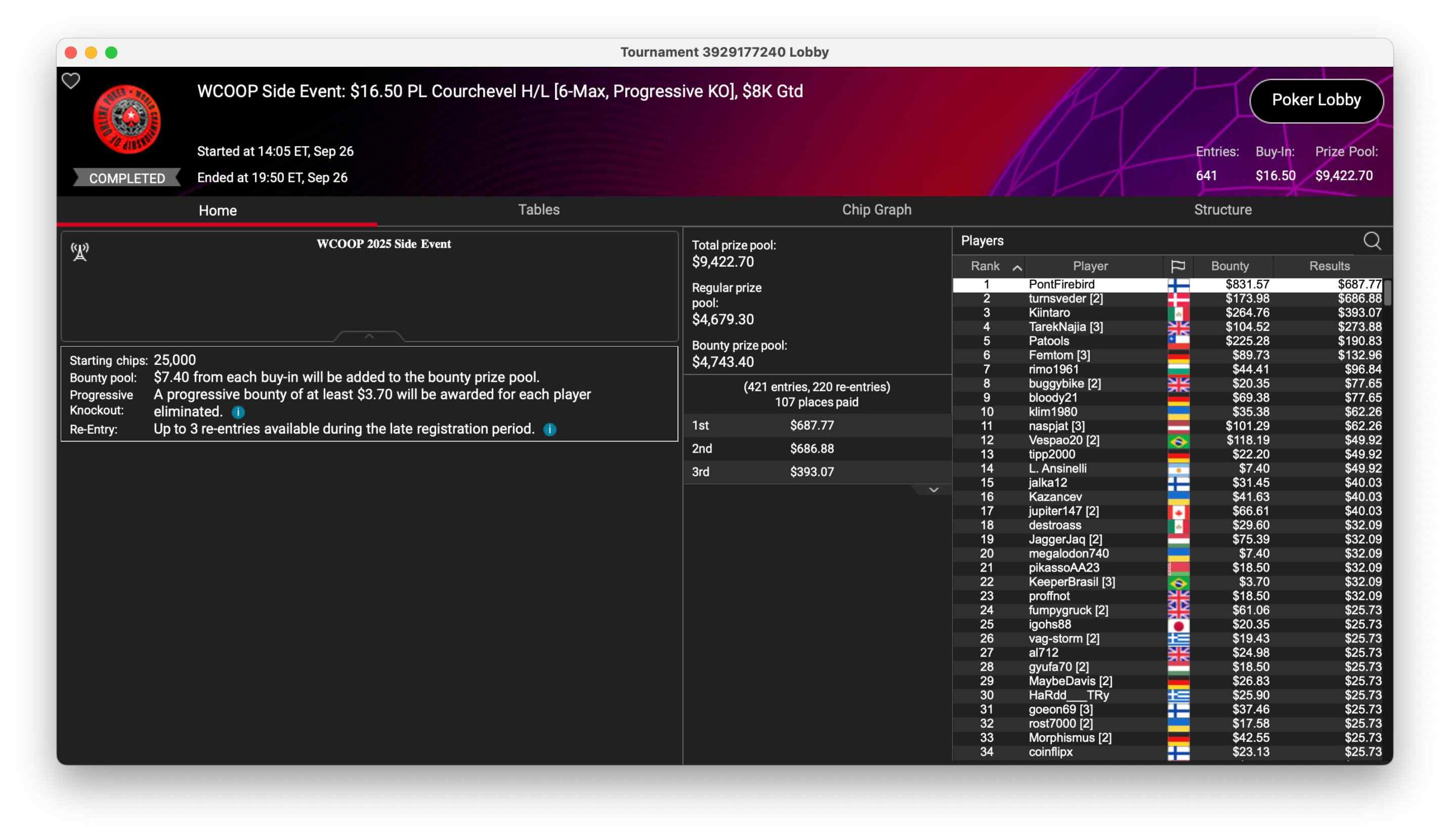 | Mon | 14:15 | WCOOP 1-L: $5.50 NLHE [Progressive][KO,][Phase][2], $250K Gtd |