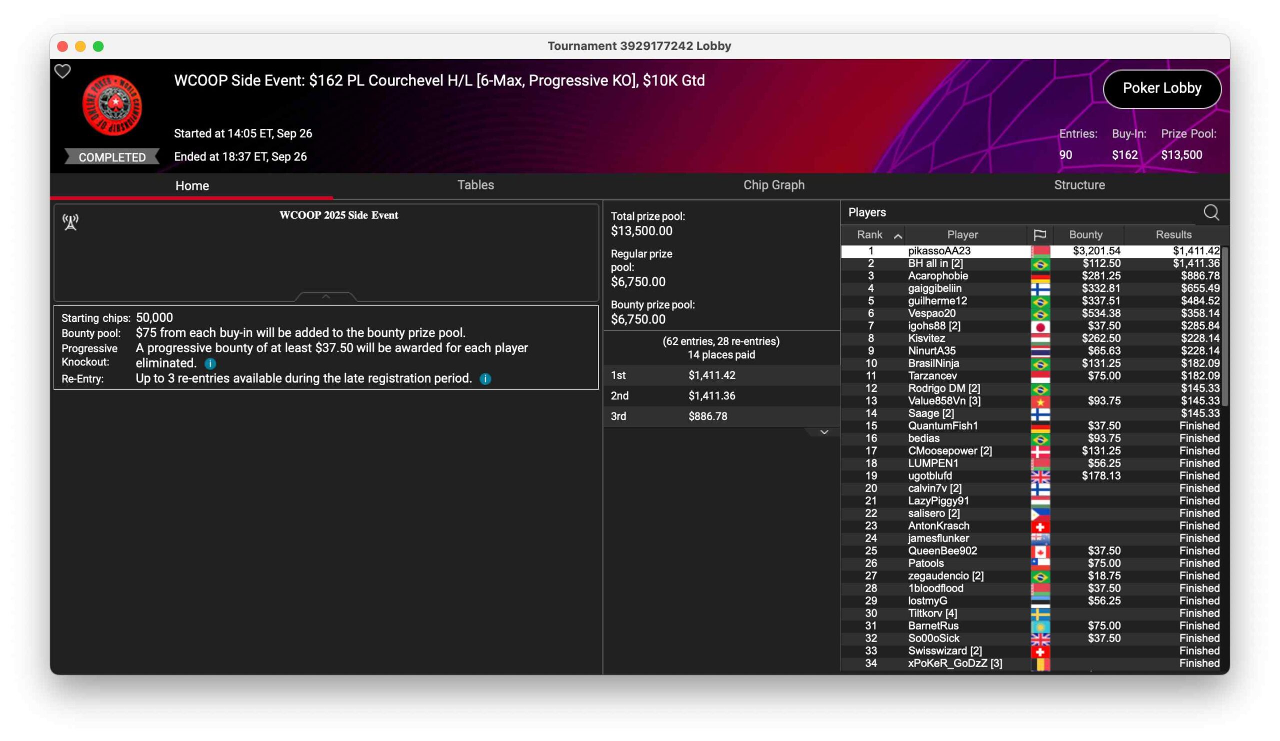 Mit dem $162 PL Courchevel H/L 6max PKO gab es ein Spezialisten-Turnier mit 90 Entries und $13.500 im Preispool. „pikassoAA23“ aus Belarus gewann das Turnier für $3.201 + $1.411.