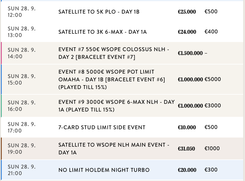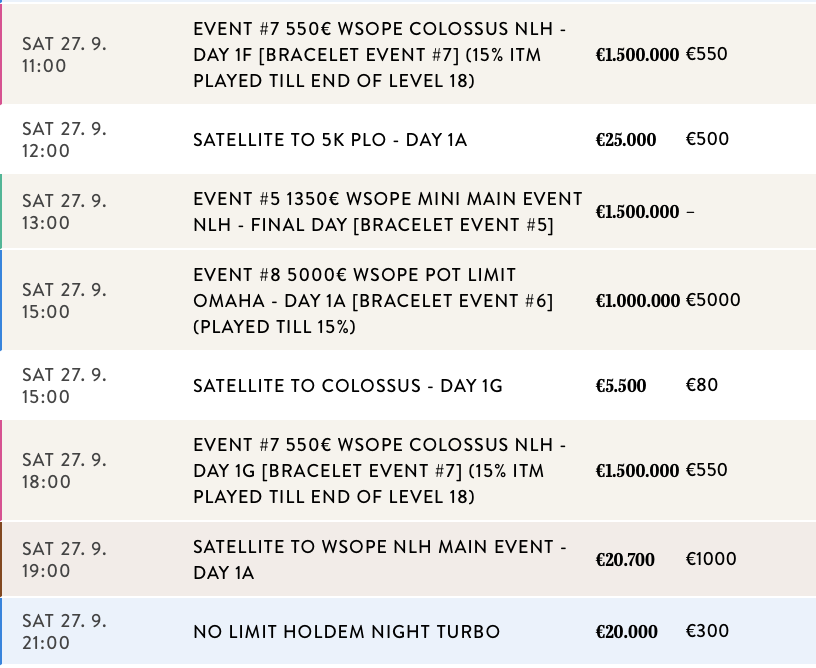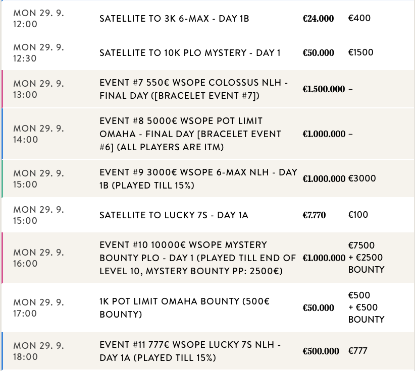 Die 23 Spieler, die noch dabei sind, haben alle €7.250 sicher. Am Final Table warten €13.400 auf die Spieler, auf den Sieger warten €216.500.