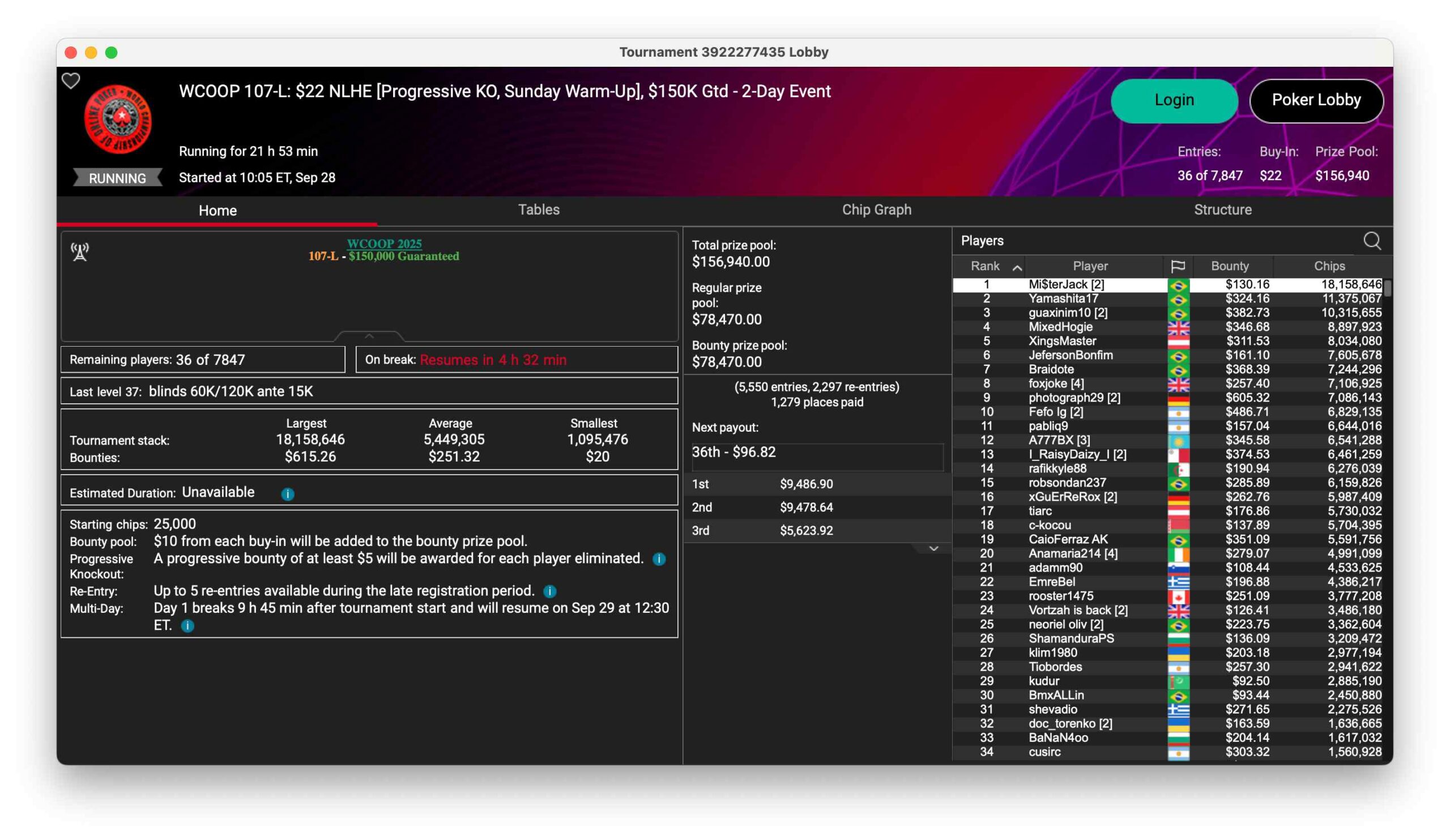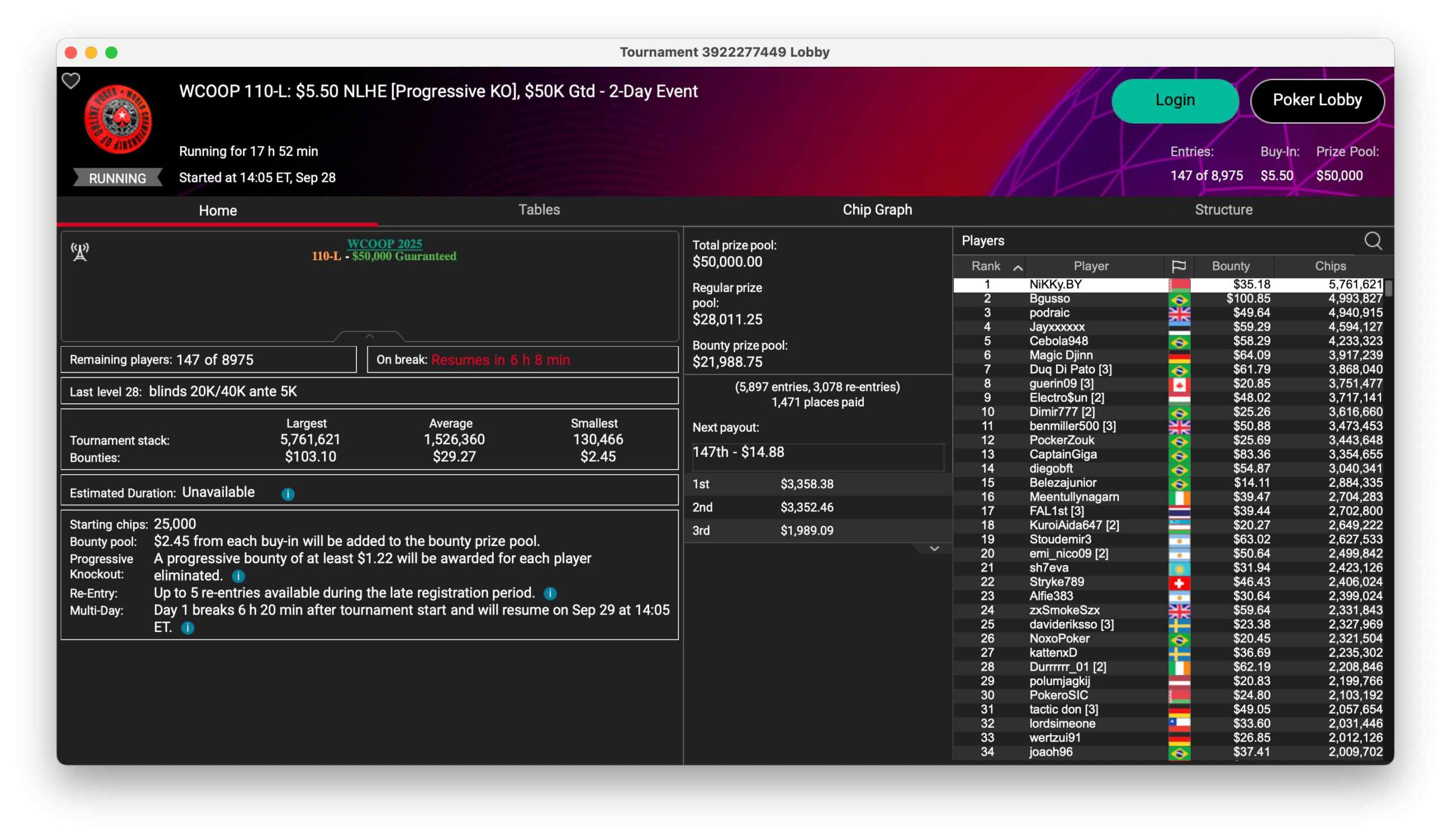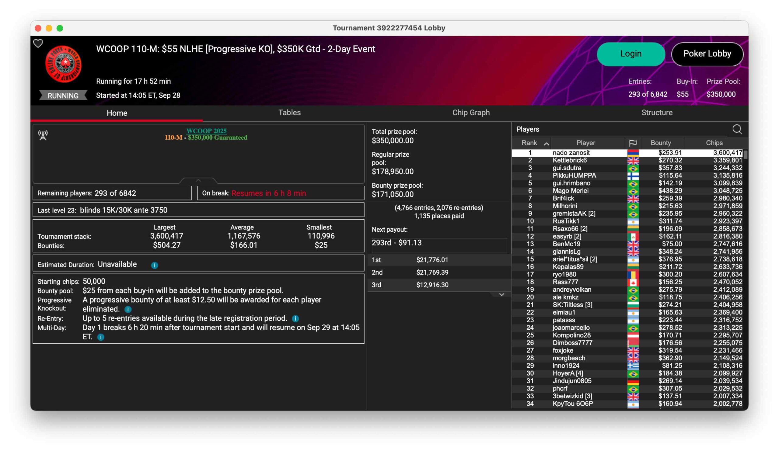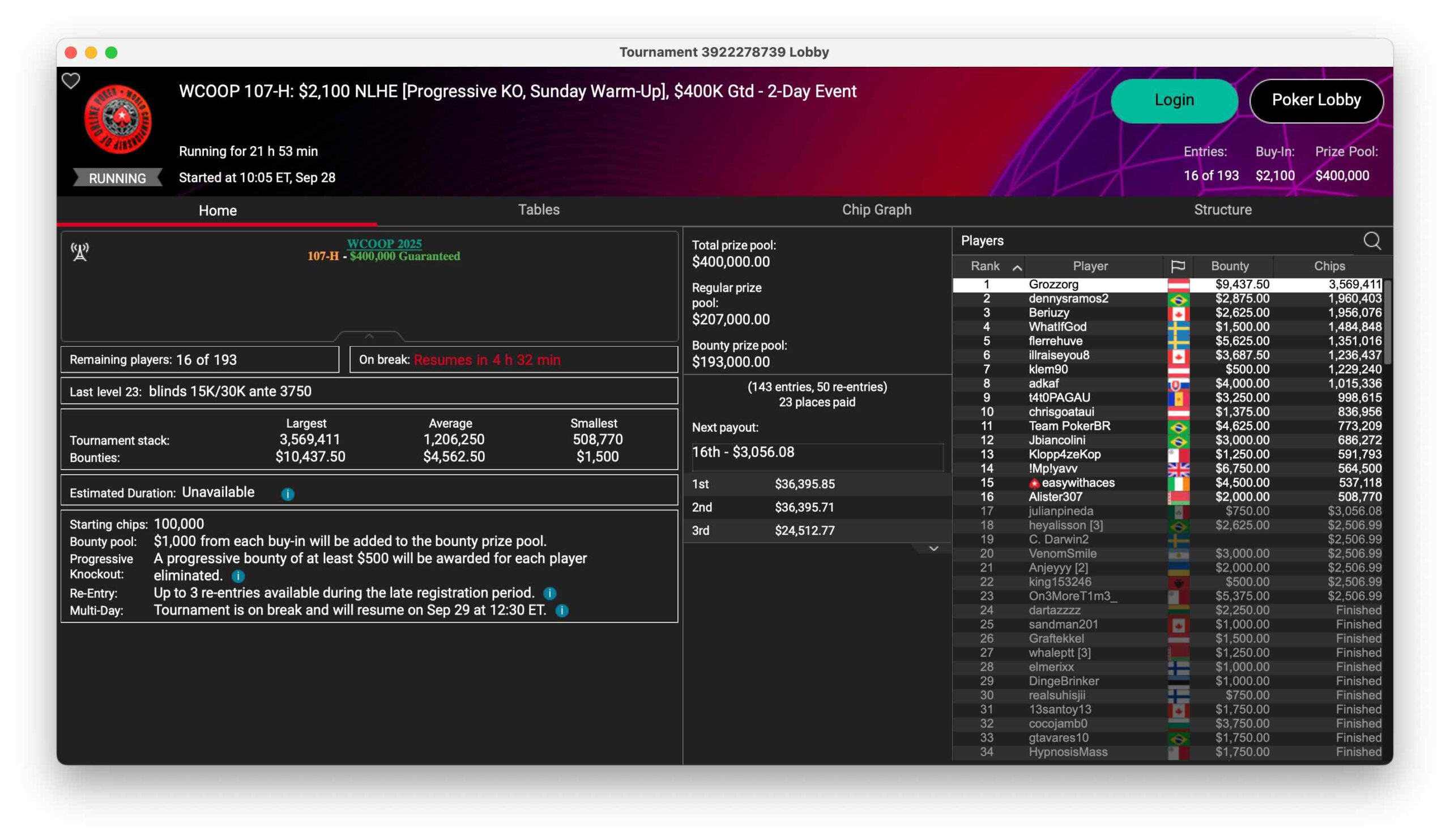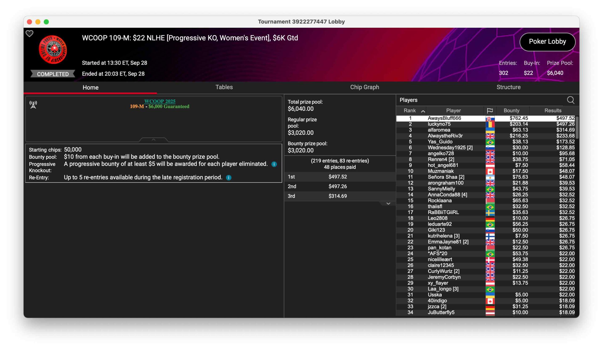 | Mon | 12:30 | WCOOP 114-H: $1,050 NLHE [Progressive][KO,][Series][Saver], $750K Gtd |