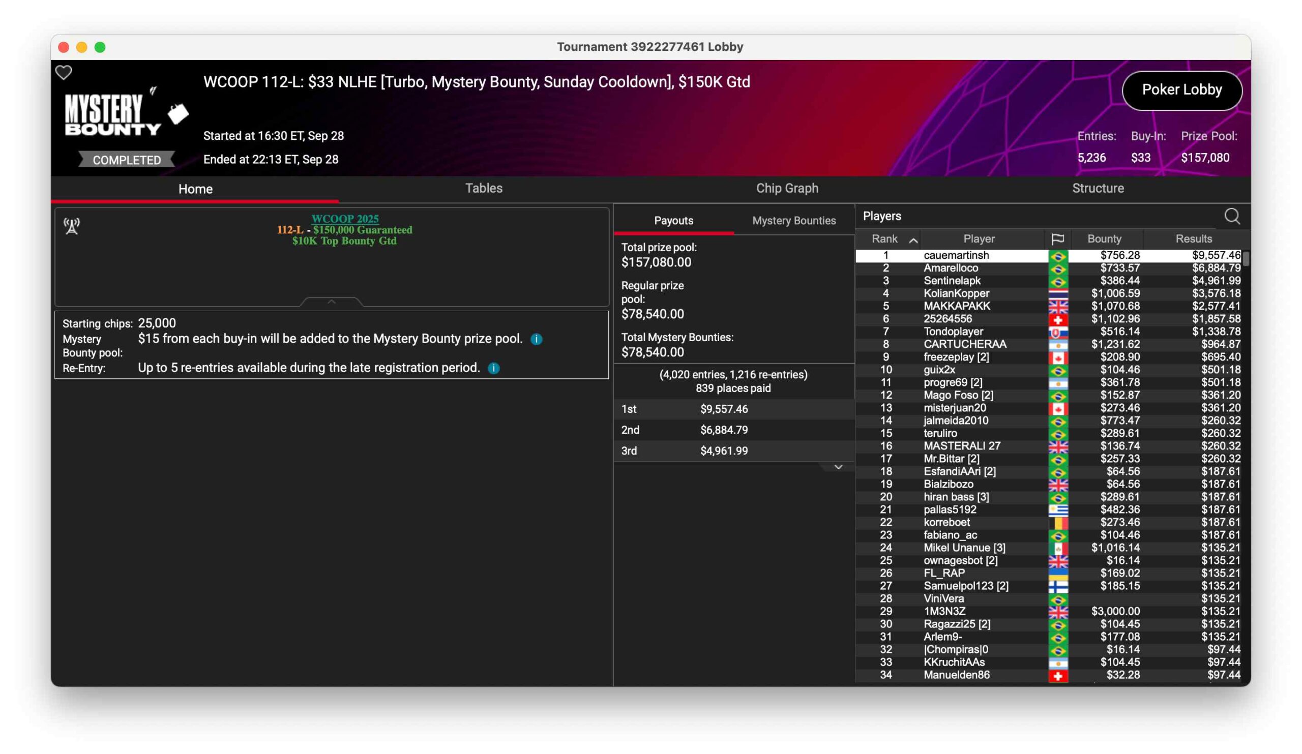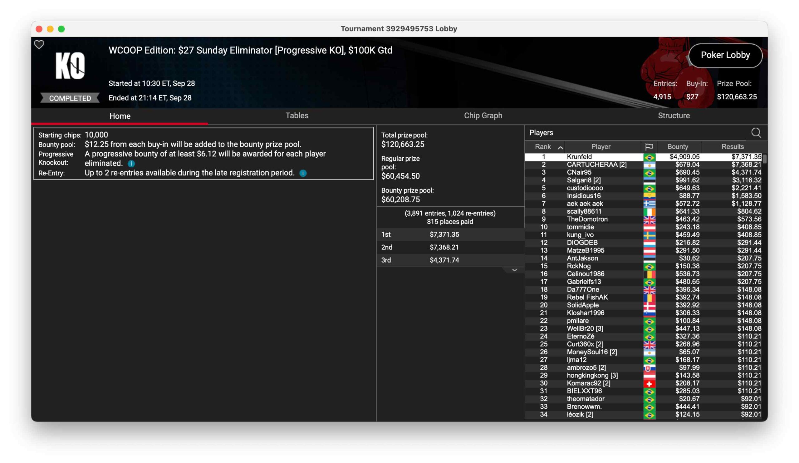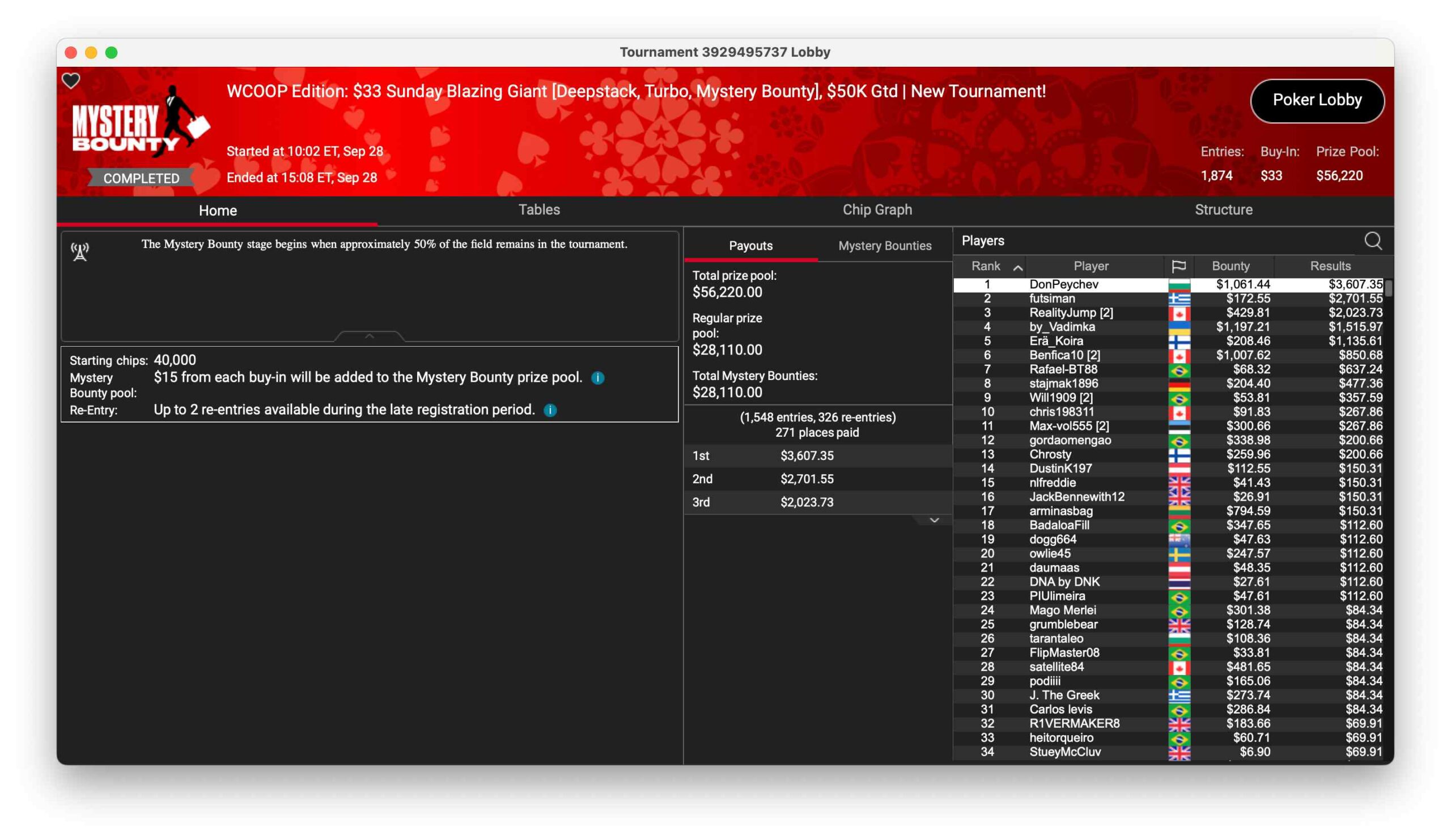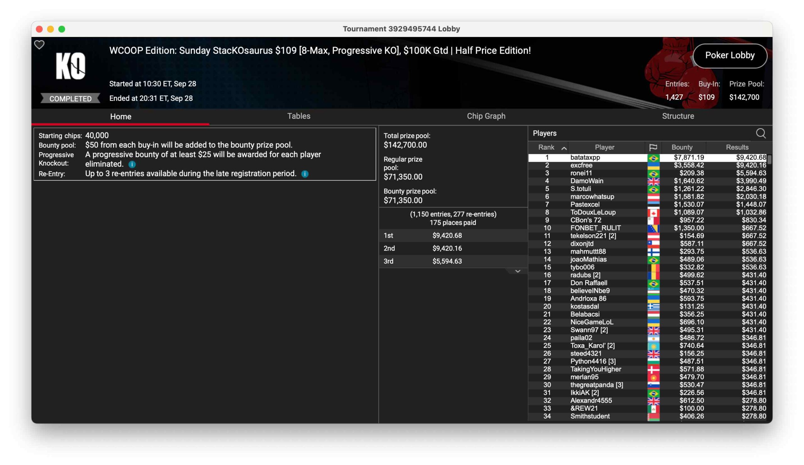 Im $75 NLHE 7max Mystery Bounty Side-Event mit 2.708 Entries und $184.631 Preispool gewann der Österreicher „calling állomás“ für $1.578 + $11.511.