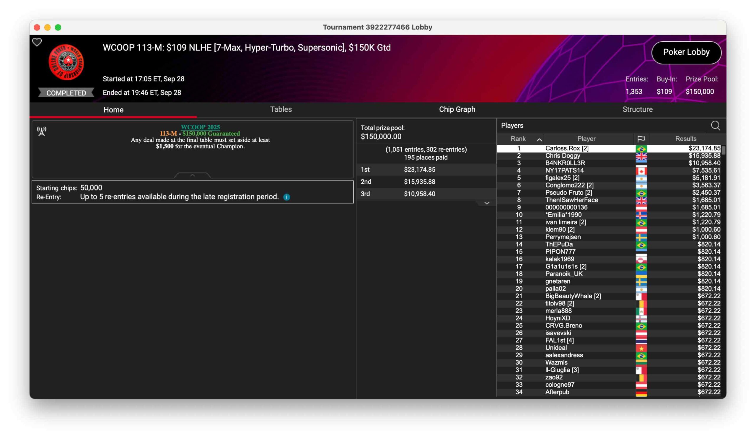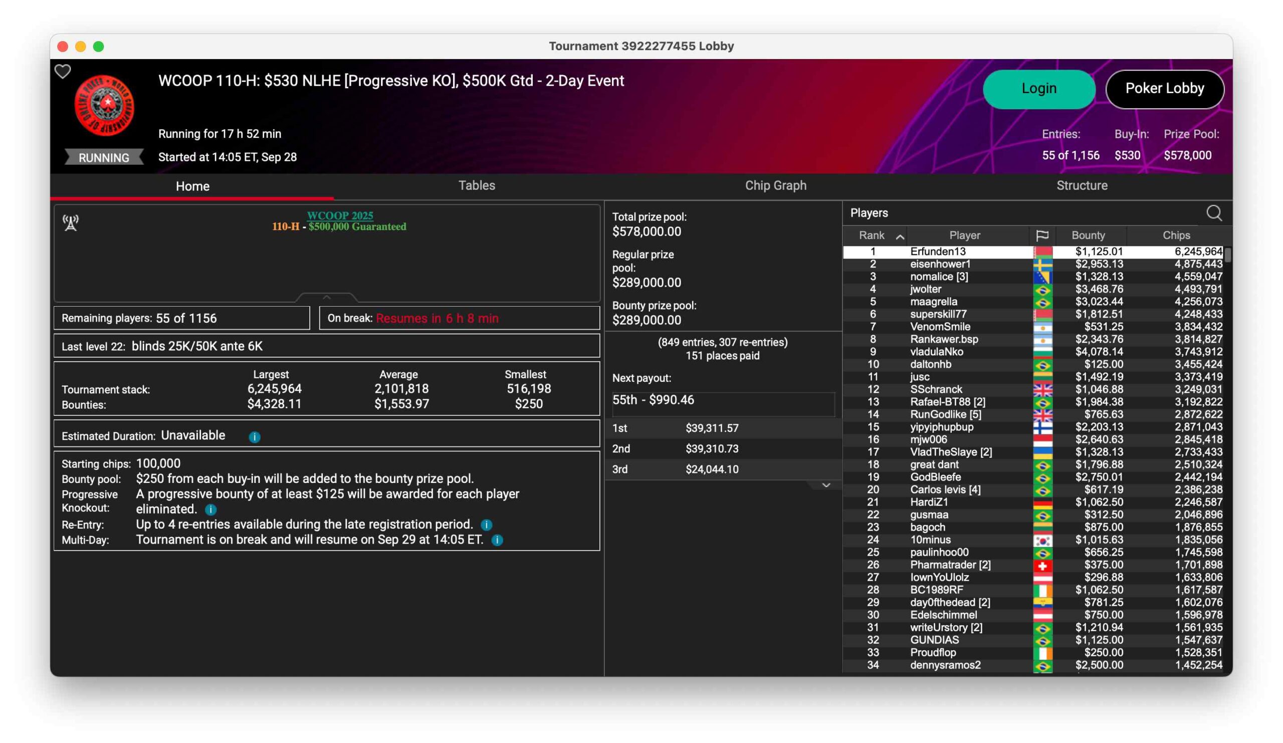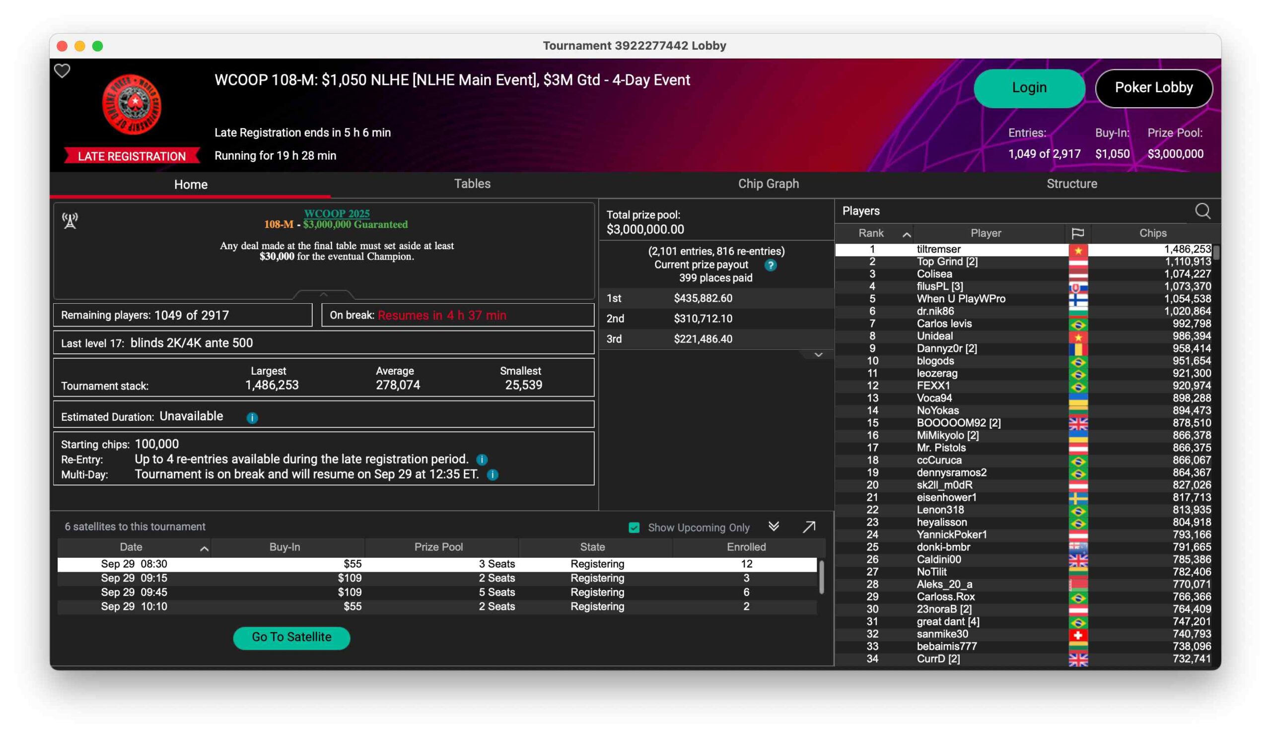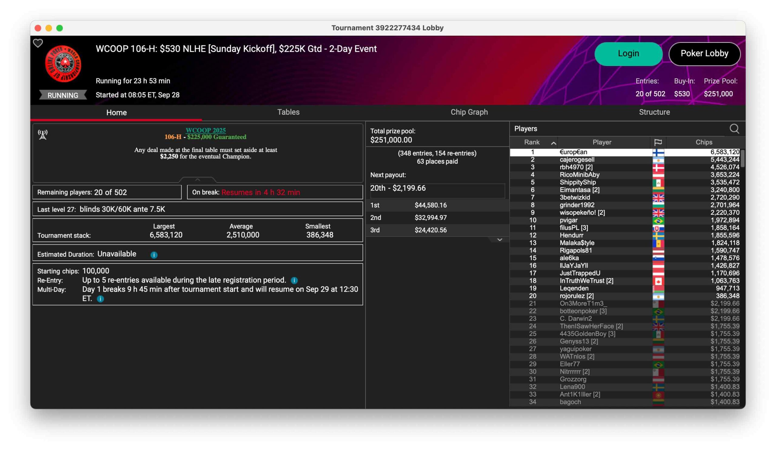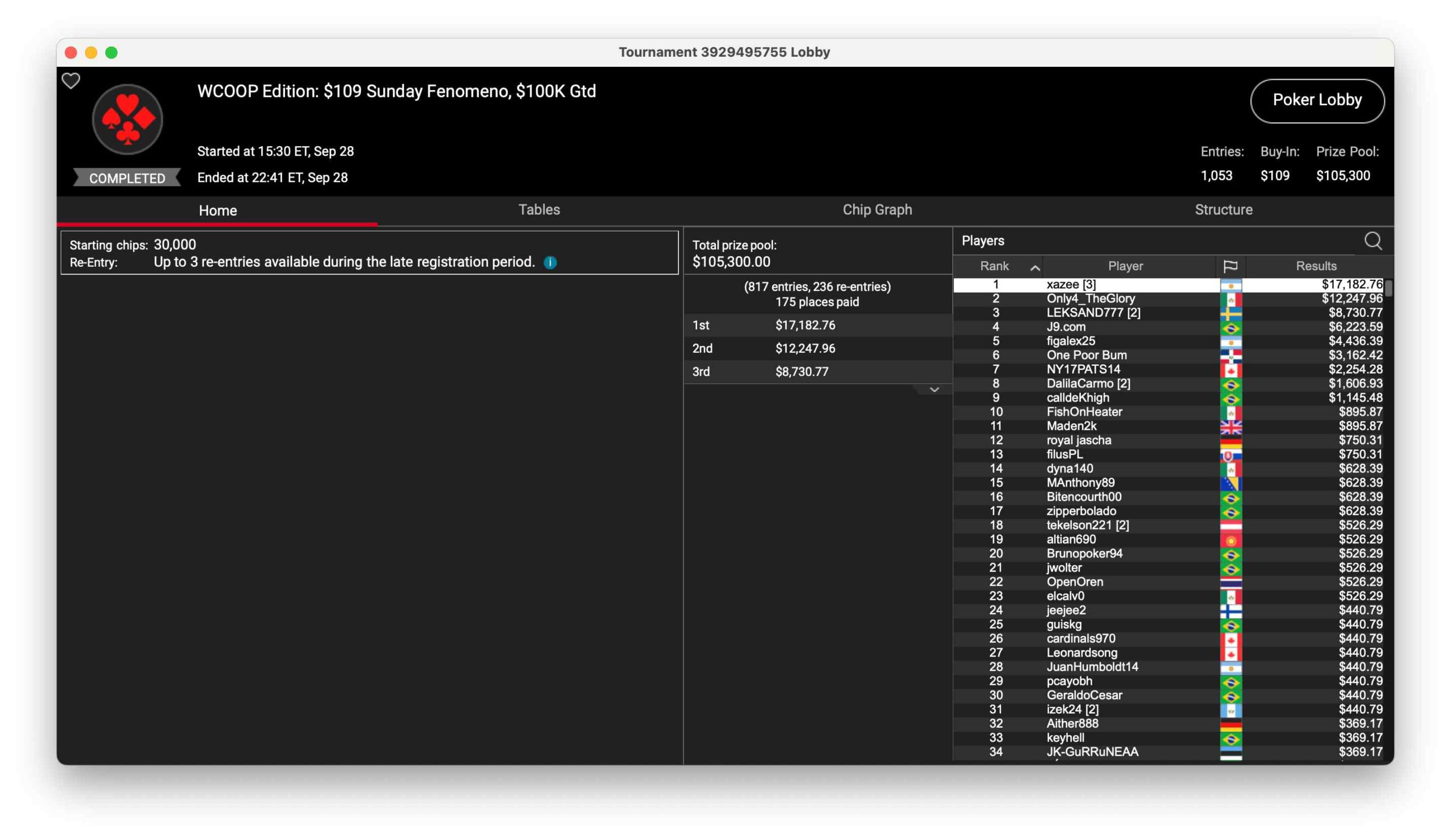 | Wed | 13:05 | WCOOP 121-H: $530 NLHE [Final][Mystery], $125K Gtd |