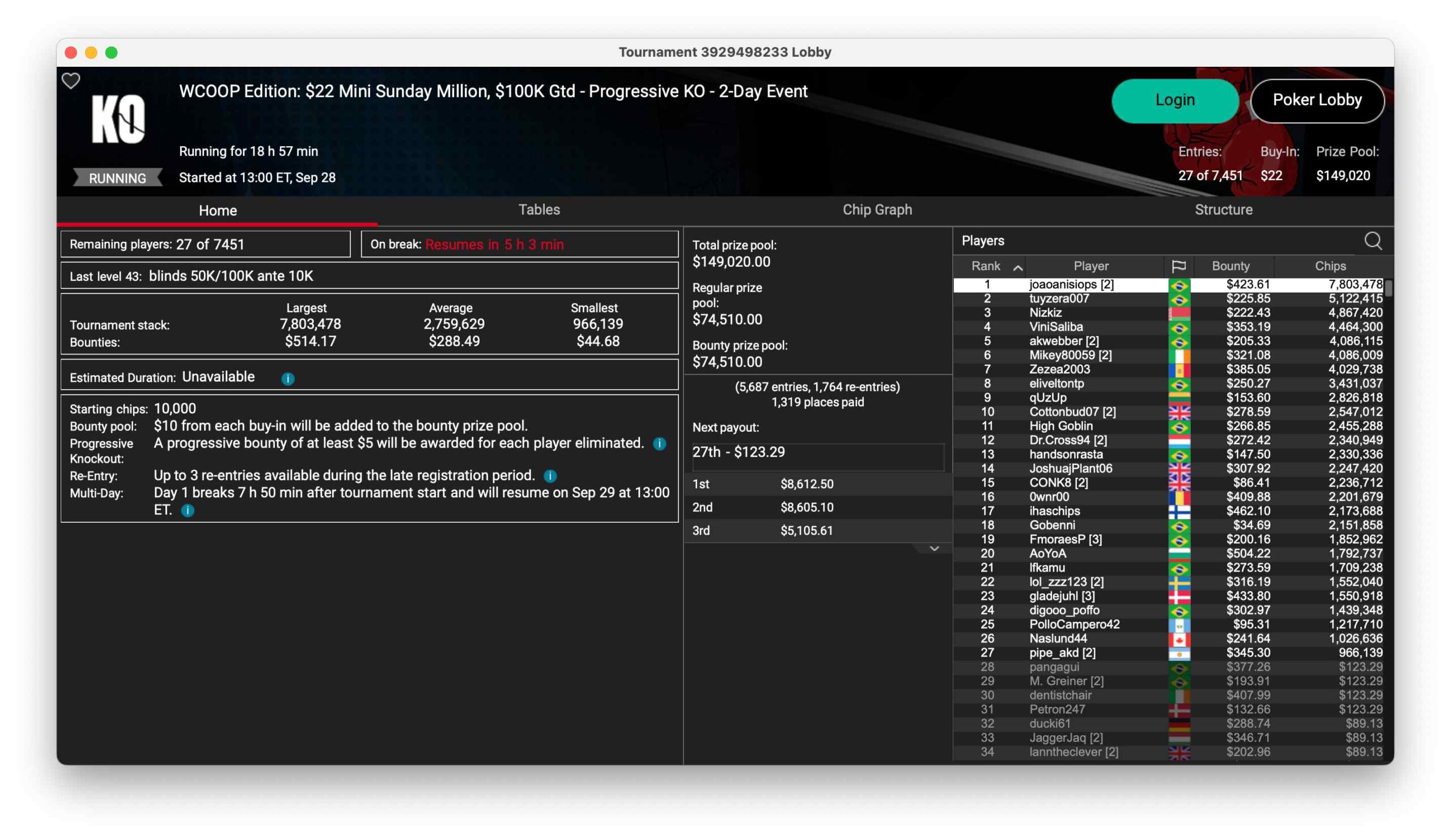 | Mon | 14:15 | WCOOP 1-M: $22 NLHE [Progressive][KO,][Phase][2], $400K Gtd |