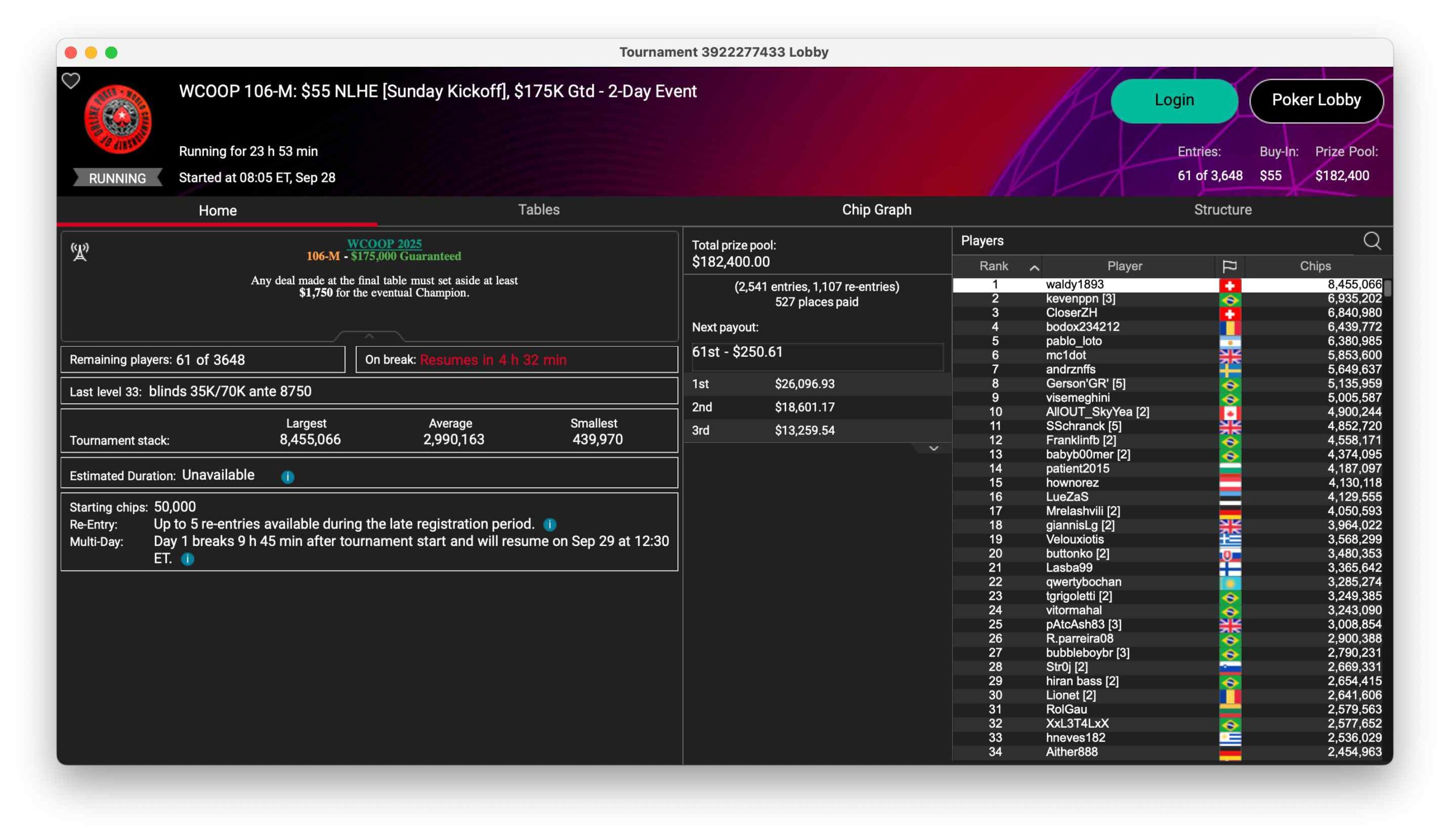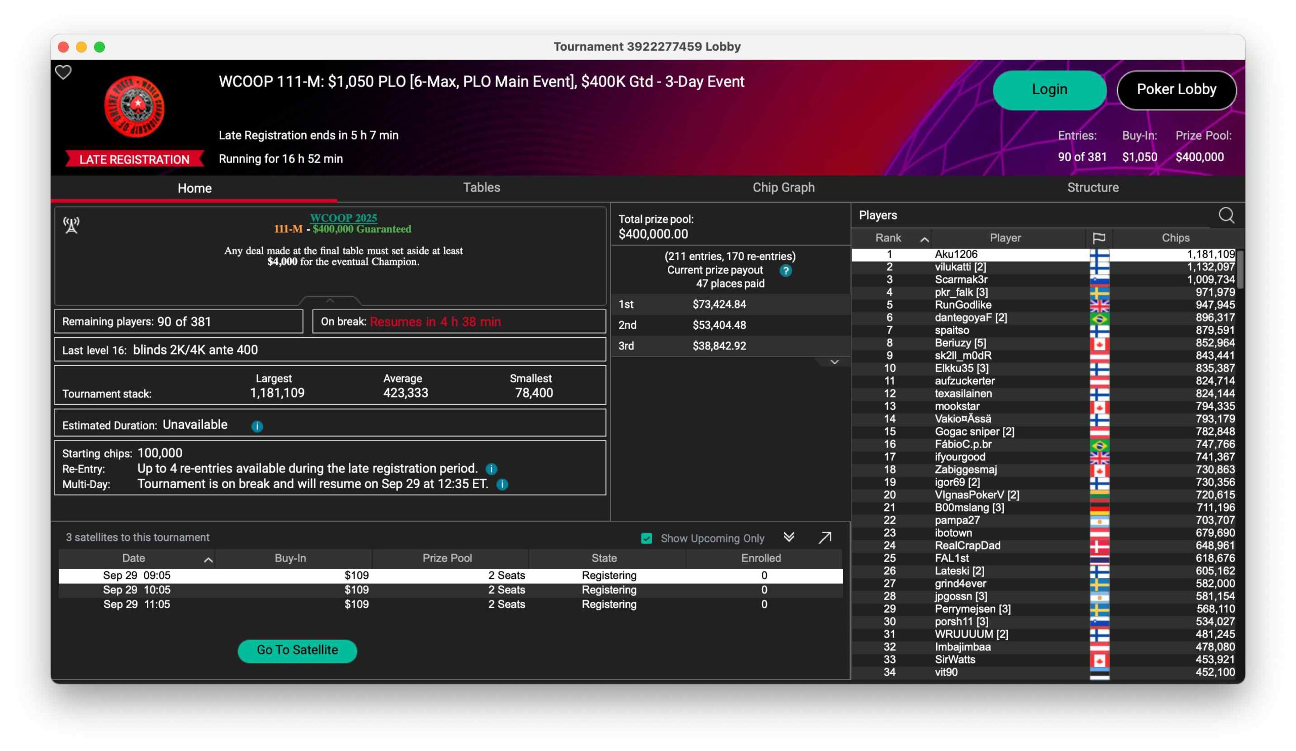 | Mon | 15:05 | WCOOP 116-H: $5,200 NLHE [Turbo,][ME][2nd][Chance], $250K Gtd |