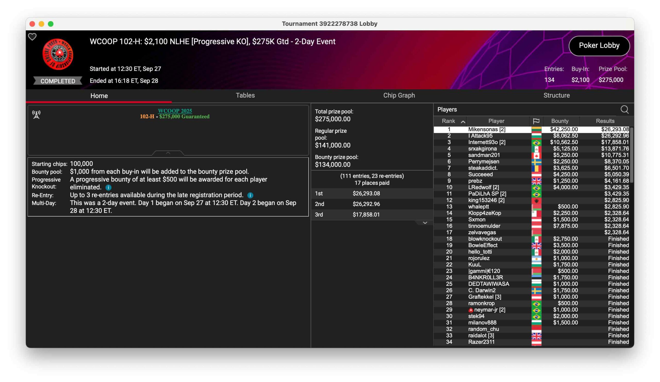 Das $2.100 NLHE PKO hatte 134 Entries, hier gab es $175.000 aus der Garantie. $42.250 + $26.293 gab es für den Sieger „Mikensonas“ aus Litauen.