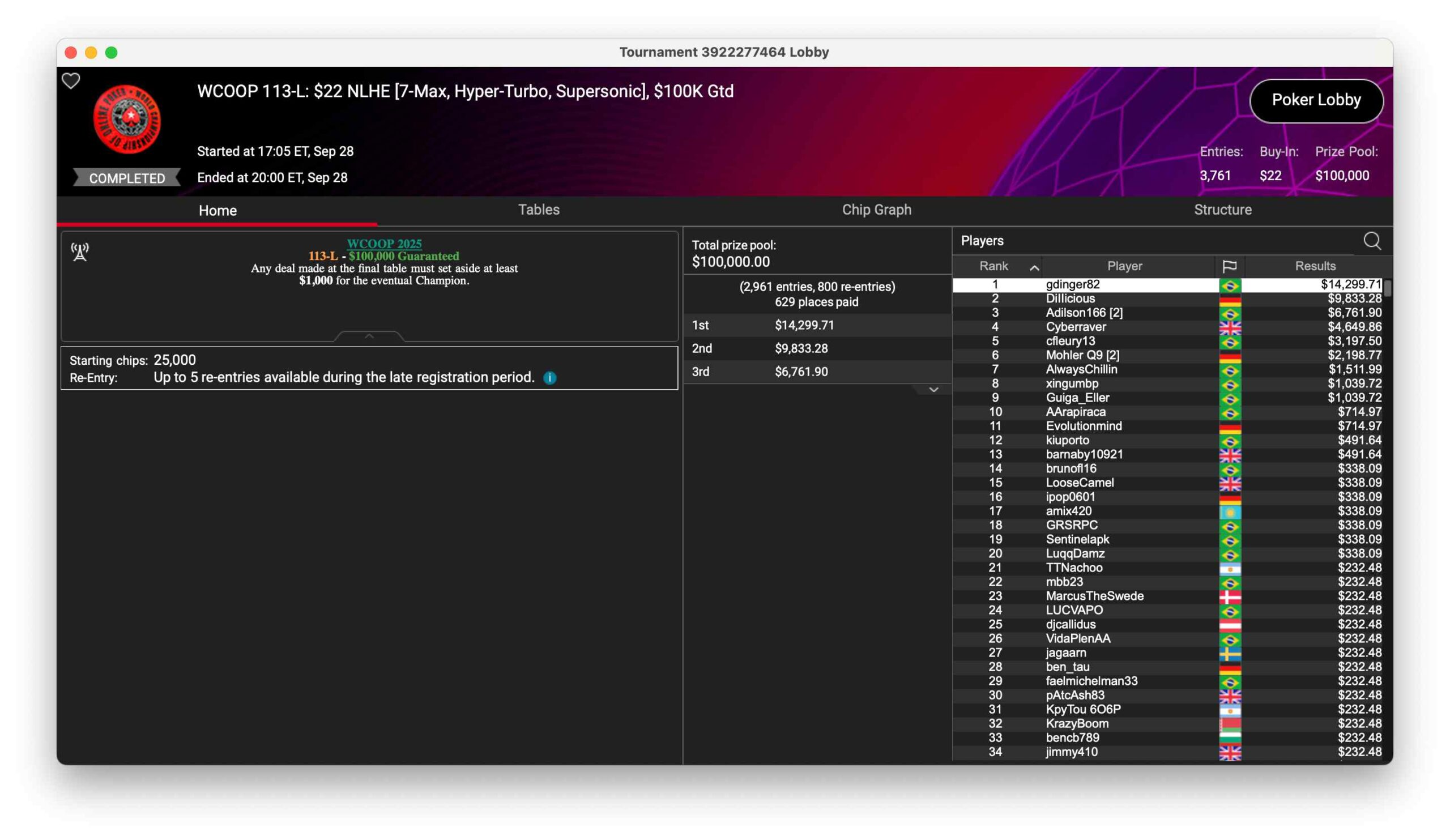Im $22 LNHE (113-L) hatte 3.761 Entries und ebenfalls ein Overlay mit $100.000 Preispool aus der Garantie. Mit „gdinger82“ gewann ein Brasilianer für $14.299. Der deutsche Spieler „Dillicious“ wurde Runner-up für $9.833.