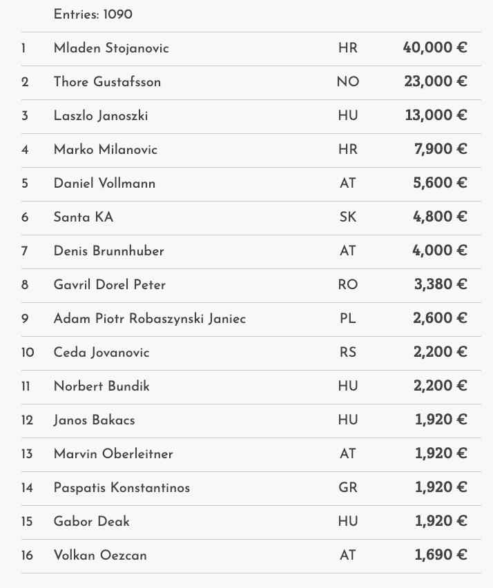 Am Final Table gab es für die Spieler aus Polen, Ungarn, Norwegen, Kroatien, Österreich und Slowakei bereits €2.600.