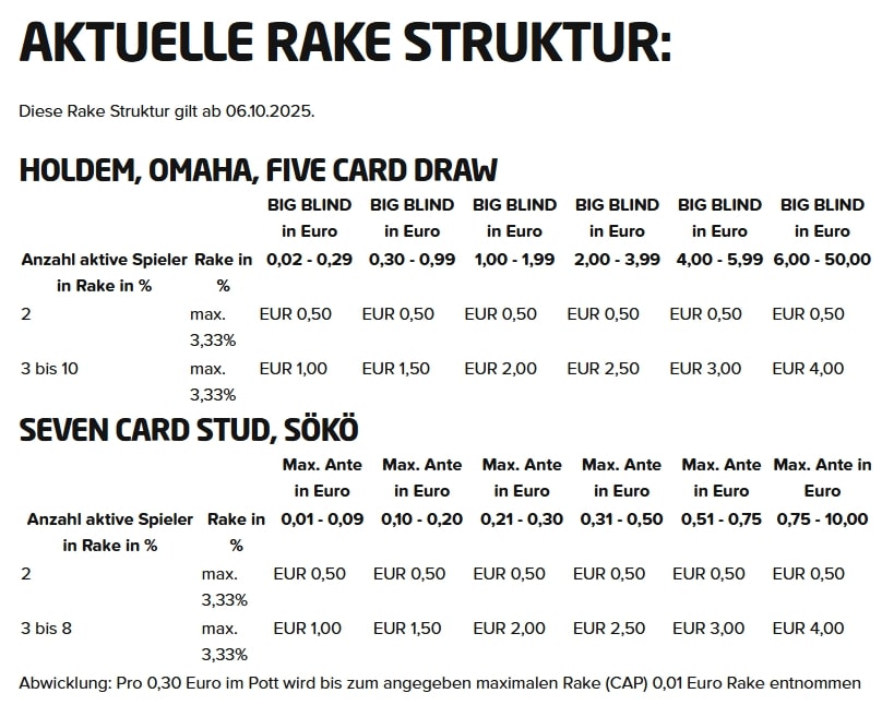 Nominal führt das zu einer Anpassung von 3,03% auf 3,33% Rake – am 06.10.2025 um 12:00 Uhr werden die neuen Tabellen in Funktion gehen und Cash Game-Hände mit der neuen Abgabe verrechnet.