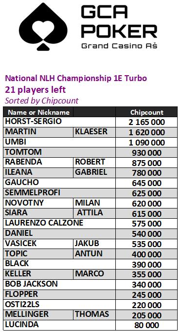 21 Spieler tüteten ihre Chips für den Finaltag ein und der Chipleader aus Tag 1E ist ‚Horst-Sergio‘.