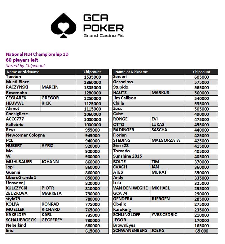 Die ersten drei Starttage hatten bisher 550 Entrys verzeichnen können und am Tag 1D kamen weitere 401 Entrys (297/104) hinzu. 60 Spieler überlebten den Tag und werden heute um 14:00 Uhr zum Finale zurückkehren. Chipleader aus diesem Flight ist ein Spieler mit dem Spitznamen ‚Torsten‚.