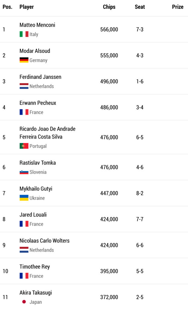 Der Italiener Matteo Menconi wird als Chipleader ins Rennen gehen, aber direkt dahinter haben wir Modar Alsoud aus Deutschland. Weitere DACH-Spieler im Rennen sind Maksym Mamon (CH) auf Rang 16, Chris Pütz (DE) auf Rang 17, Ersin Ical (CH) auf Rang 29 und Niclas Thumm (DE) auf Rang 55.