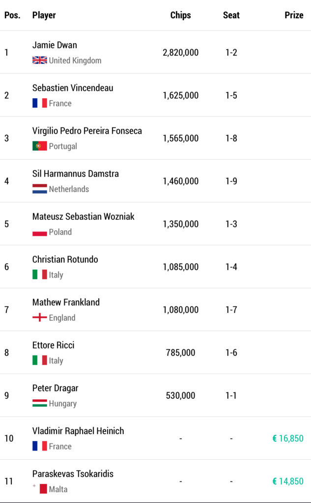 Am Ende des spannenden Tages, der das Ziehen der Mystery Bounties beinhaltete, blieben 11 Spieler für das heutige Finale übrig. Chipleader ist der Brite Jamie Dwan und es gibt weder große Namen, die noch im Rennen sind, noch DACH-Vertretungen.
